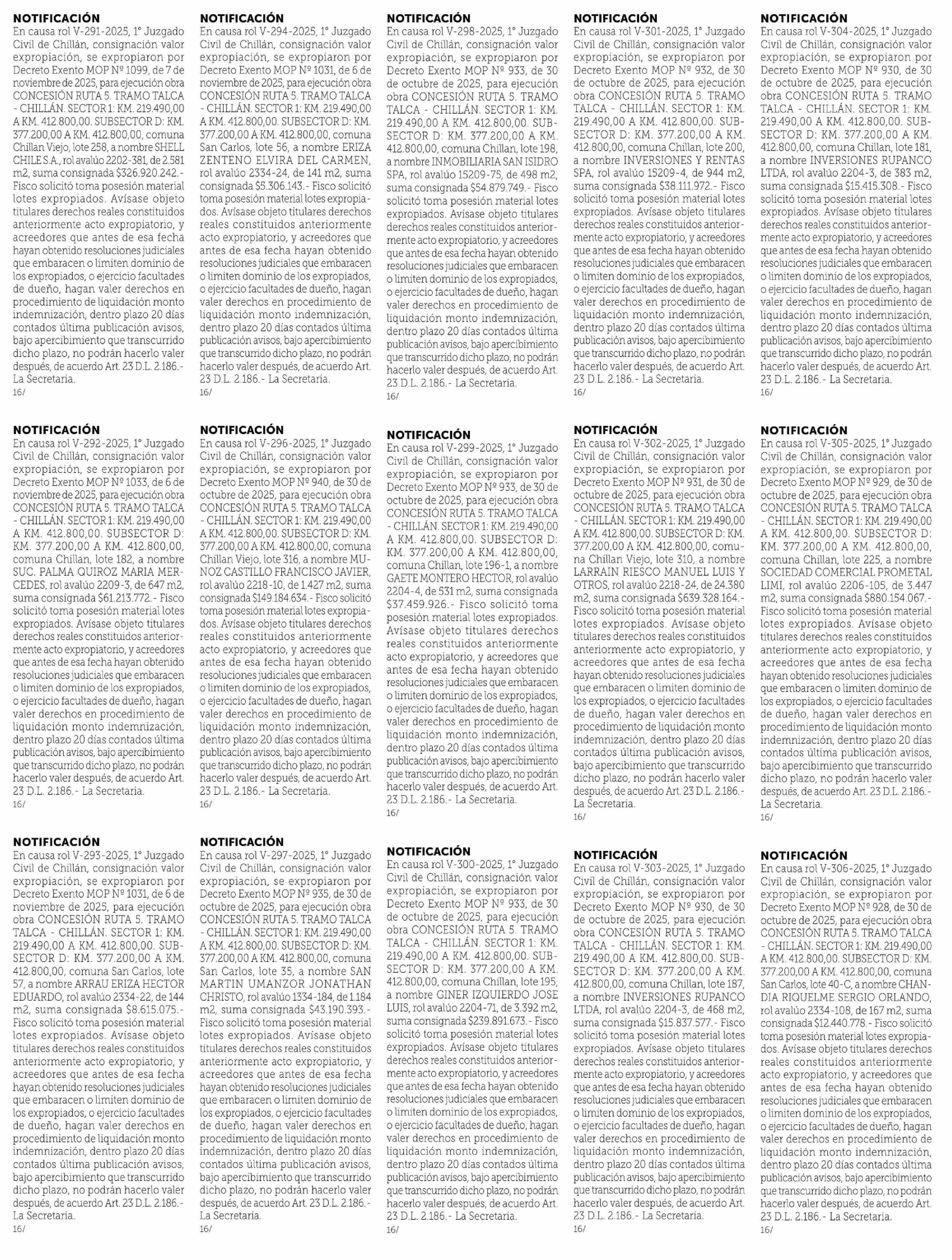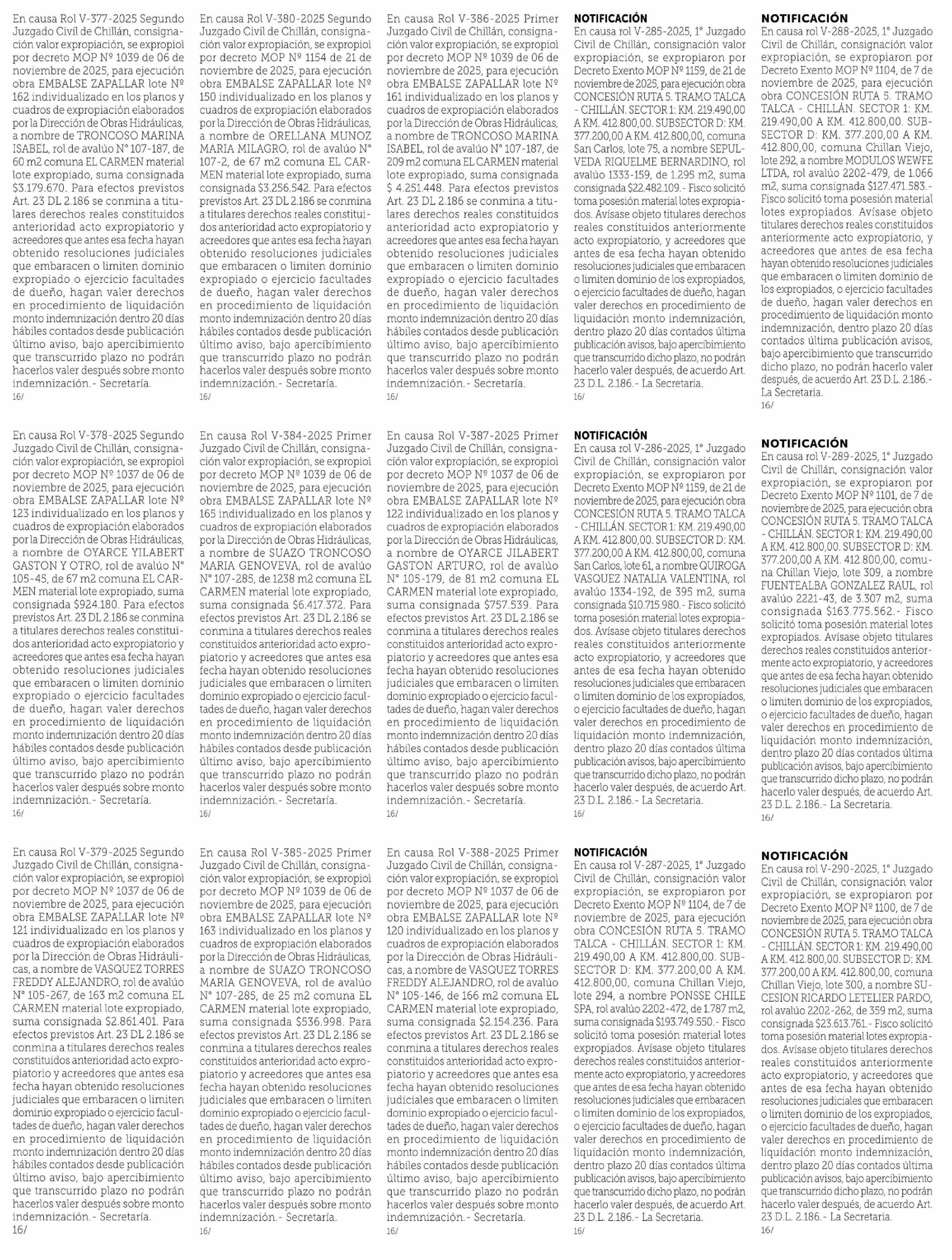 Título: En causa Rol V-377-2025 Segundo Juzgado Civil de Chillán, consignación valor expropiación, se expropioì por decreto MOP Nº 1039 de 06 de noviembre de 2025, para ejecución obra EMBALSE ZAPALLAR lote Nº 162 individualizado en los planos y cuadros de expropiación elaborados por la Dirección de Obras Hi