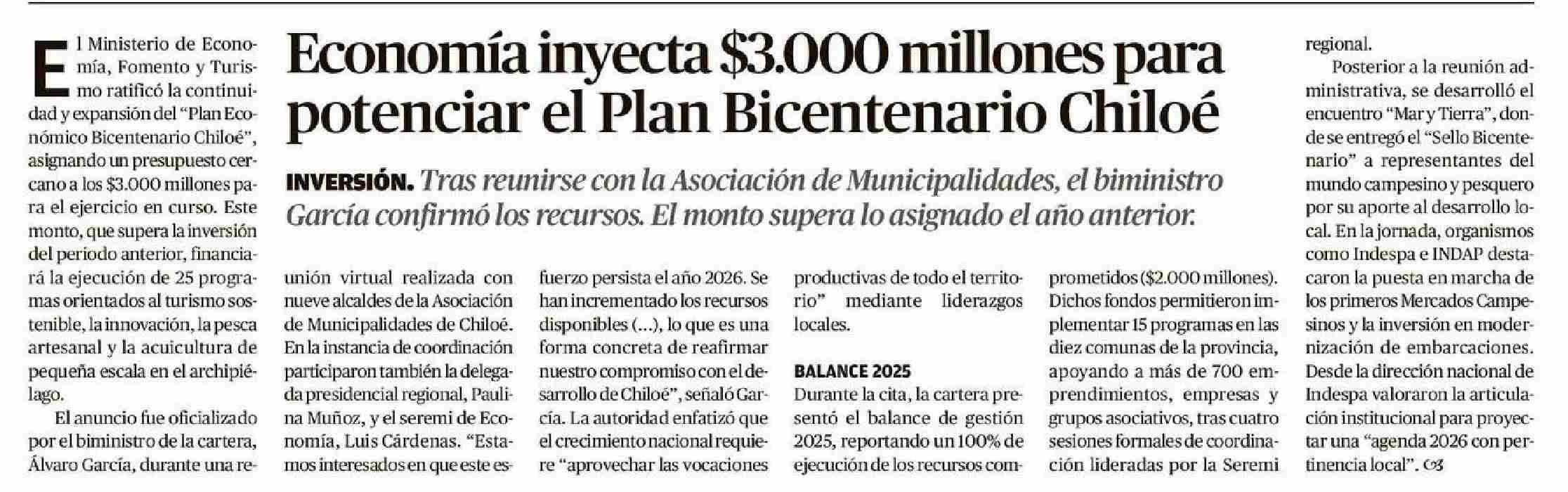 Economía inyecta $3.000 millones para potenciar el Plan Bicentenario Chiloé