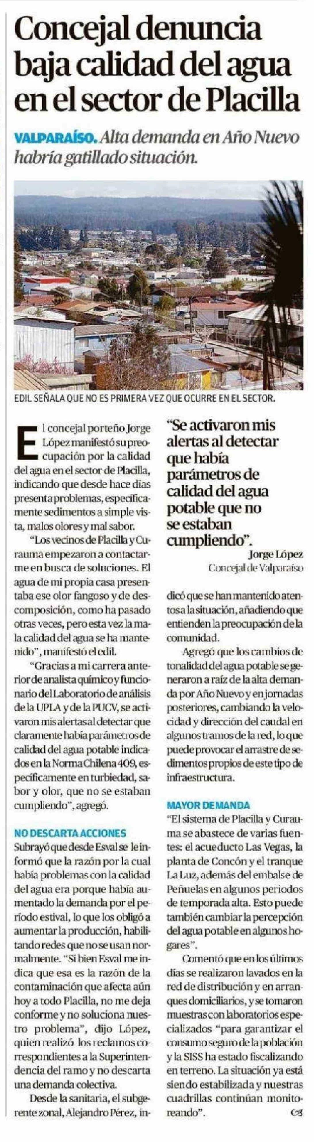 Concejal denuncia baja calidad del agua en el sector de Placilla