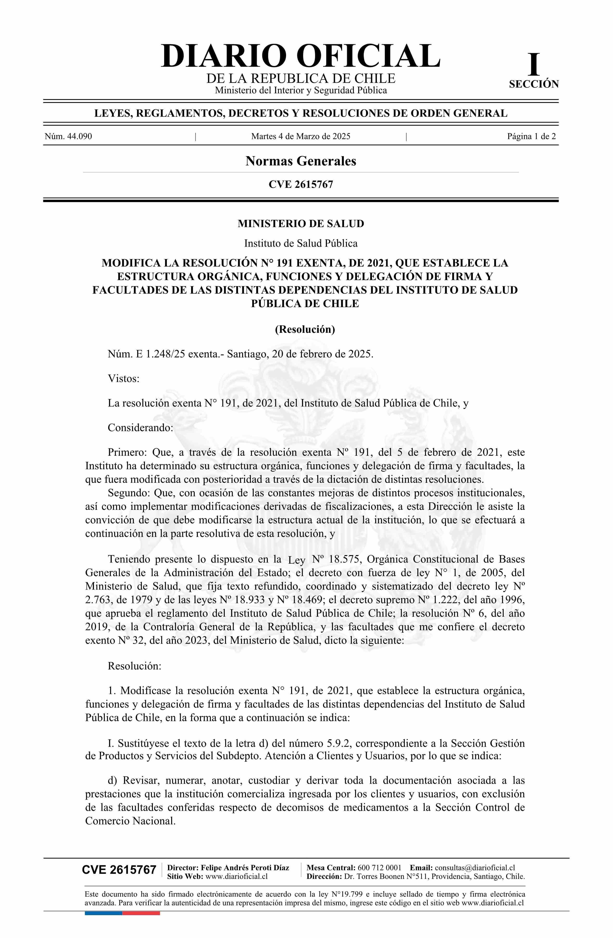 | Título: | Resolución exenta número E 1.248/25, de 2025.- Modifica la resolución N° 191 exenta, de 2021, que establece la estructura orgánica, funciones y delegación de firma y facultades de las distintas dependencias del Instituto de Salud Pública de Chile |