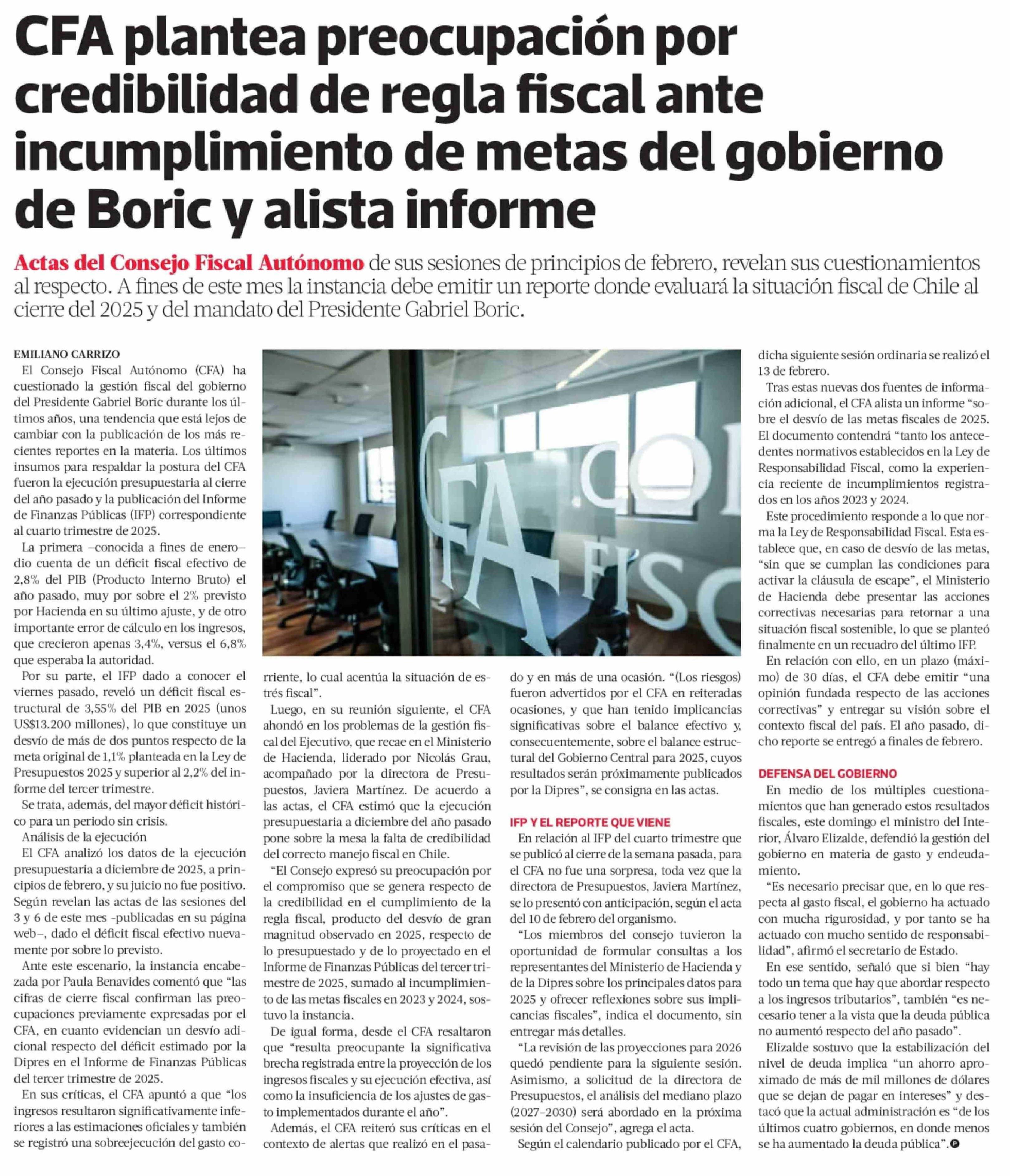 CFA plantea preocupación por credibilidad de regla fiscal ante incumplimiento de metas del gobierno de Boric y alista informe