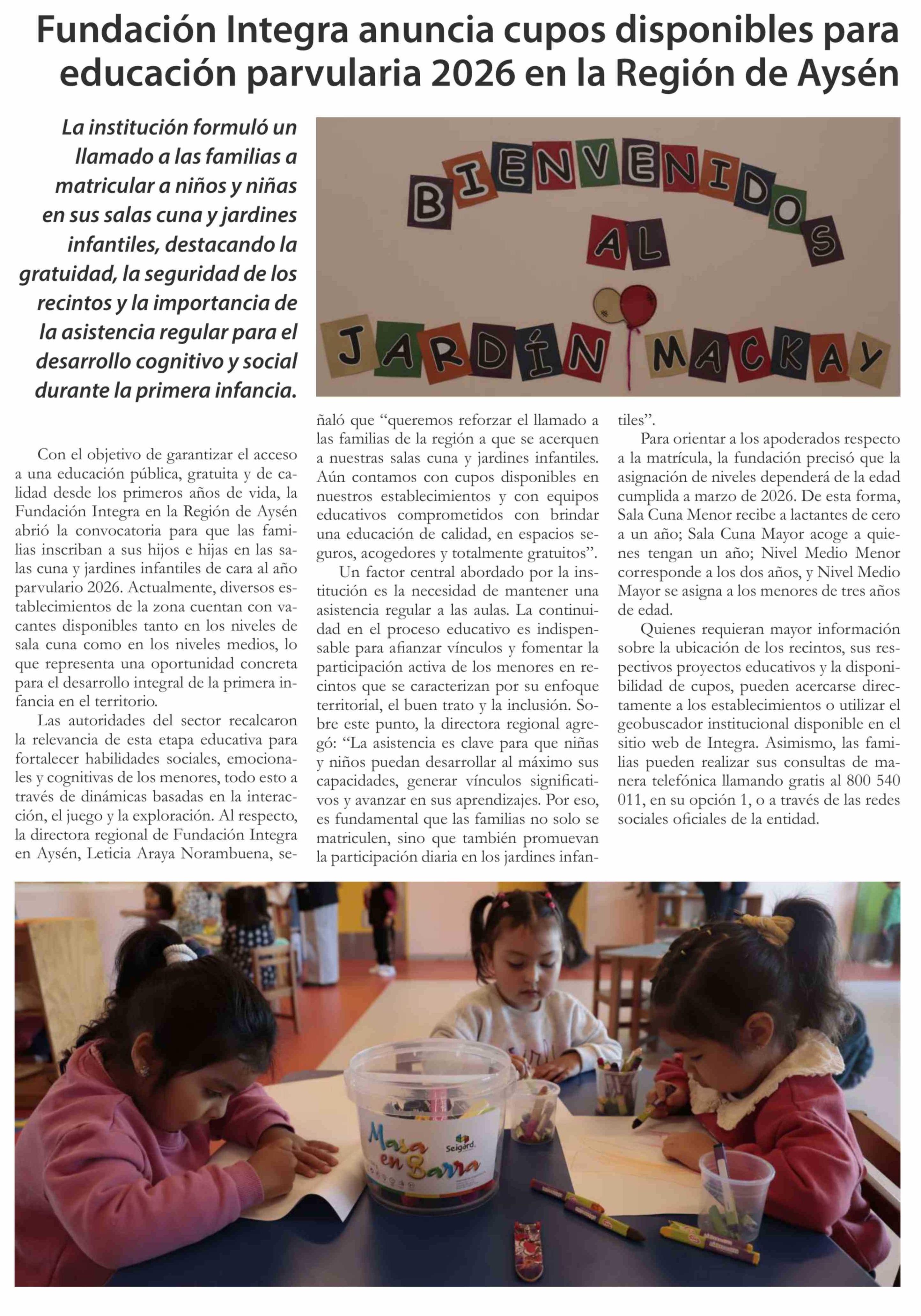 Fundación Integra anuncia cupos disponibles para educación parvularia 2026 en la Región de Aysén