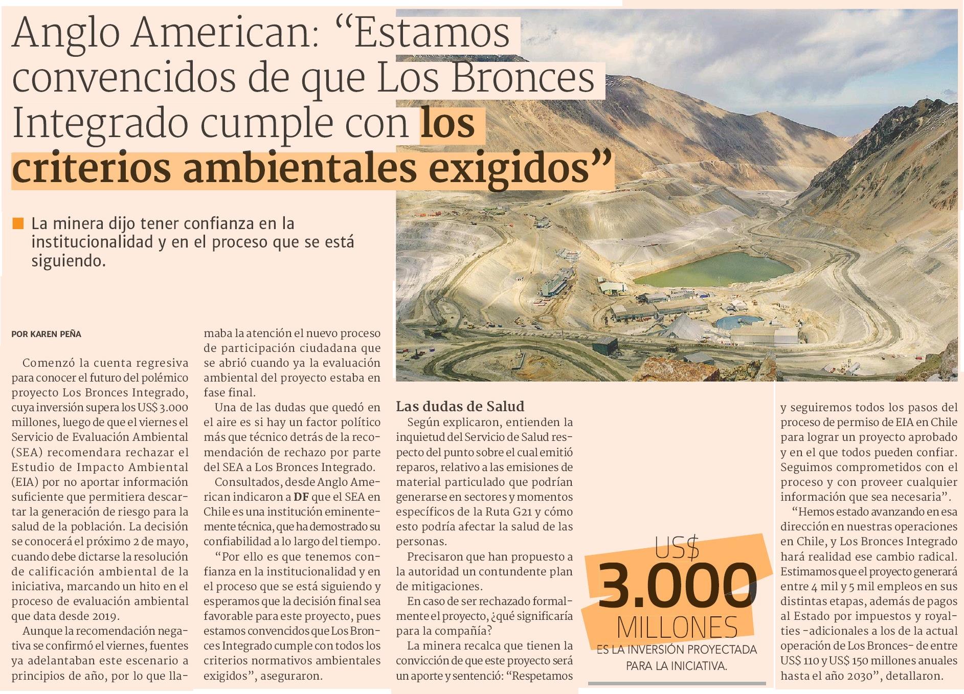 Anglo American: "Estamos convencidos de que Los Bronces Integrado cumple con los criterios ambientales exigidos"