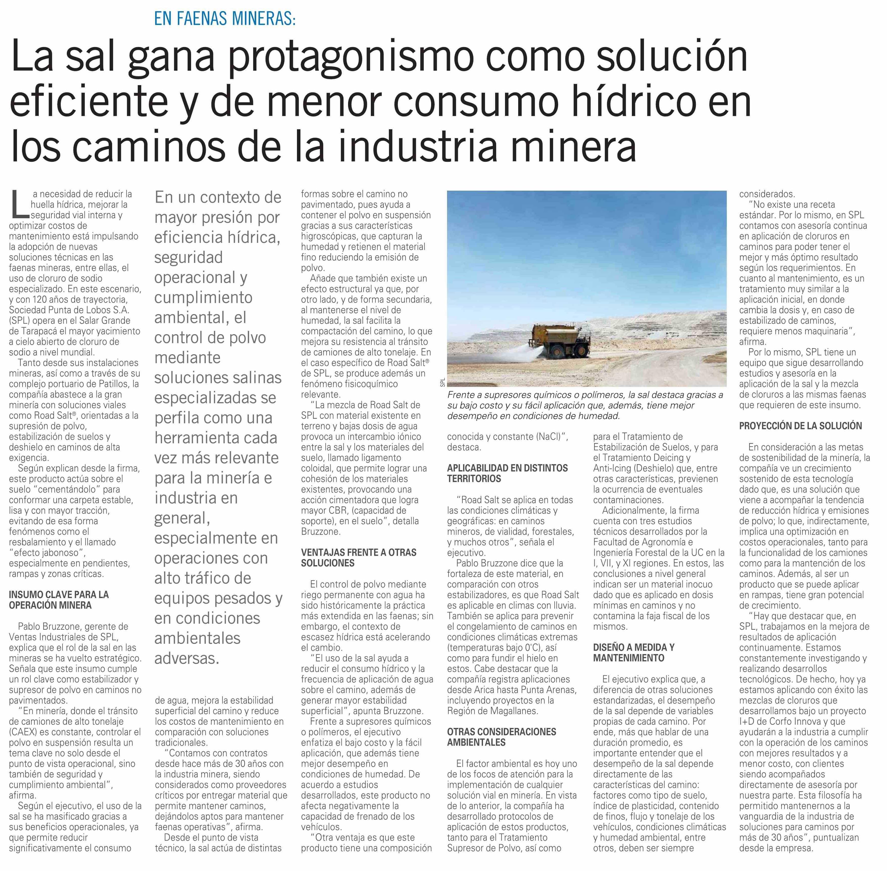 La sal gana protagonismo como solución eficiente y de menor consumo hídrico en los caminos de la industria minera