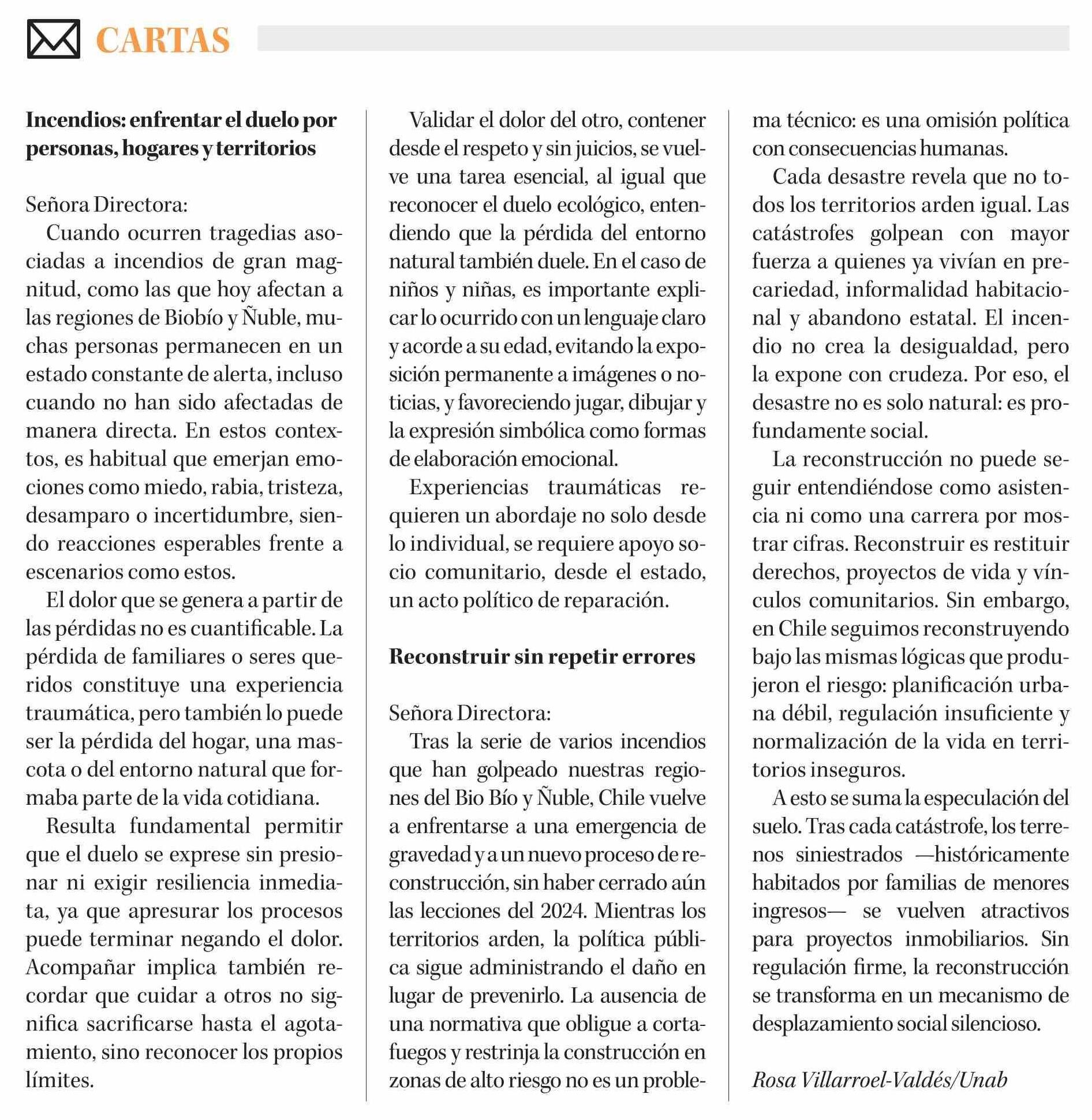 Título: Señora Directora: Cuando ocurren tragedias asociadas a incendios de gran magnitud, como las que hoy afectan a las regiones de Biobío y Ñuble, muchas personas permanecen en un estado constante de alerta, incluso cuando no han sido afectadas de manera directa. En estos contextos, es habitual que emerj