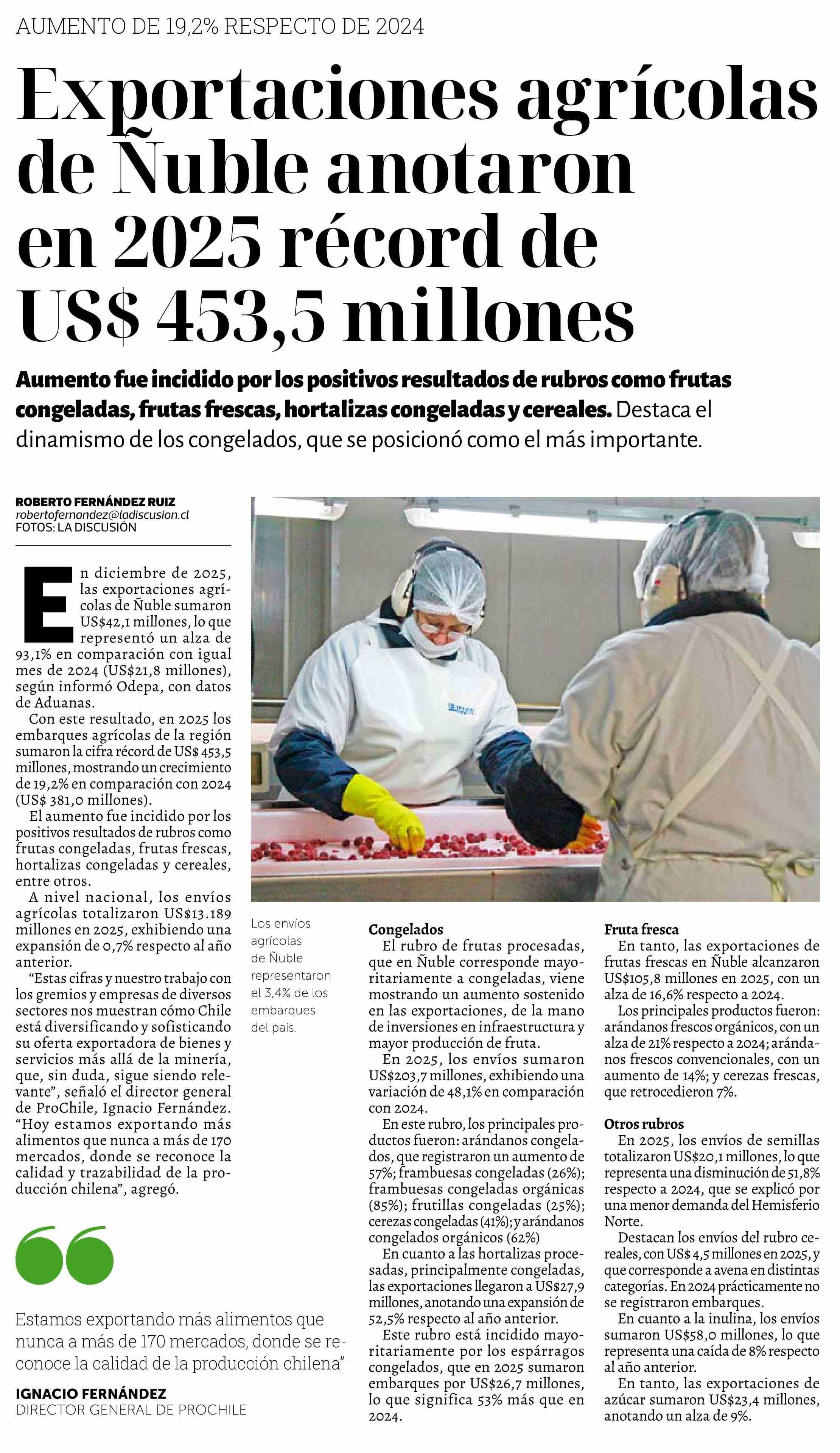 Exportaciones agrícolas de Nuble anotaron en 2025 récord de US$ 453,5 millones