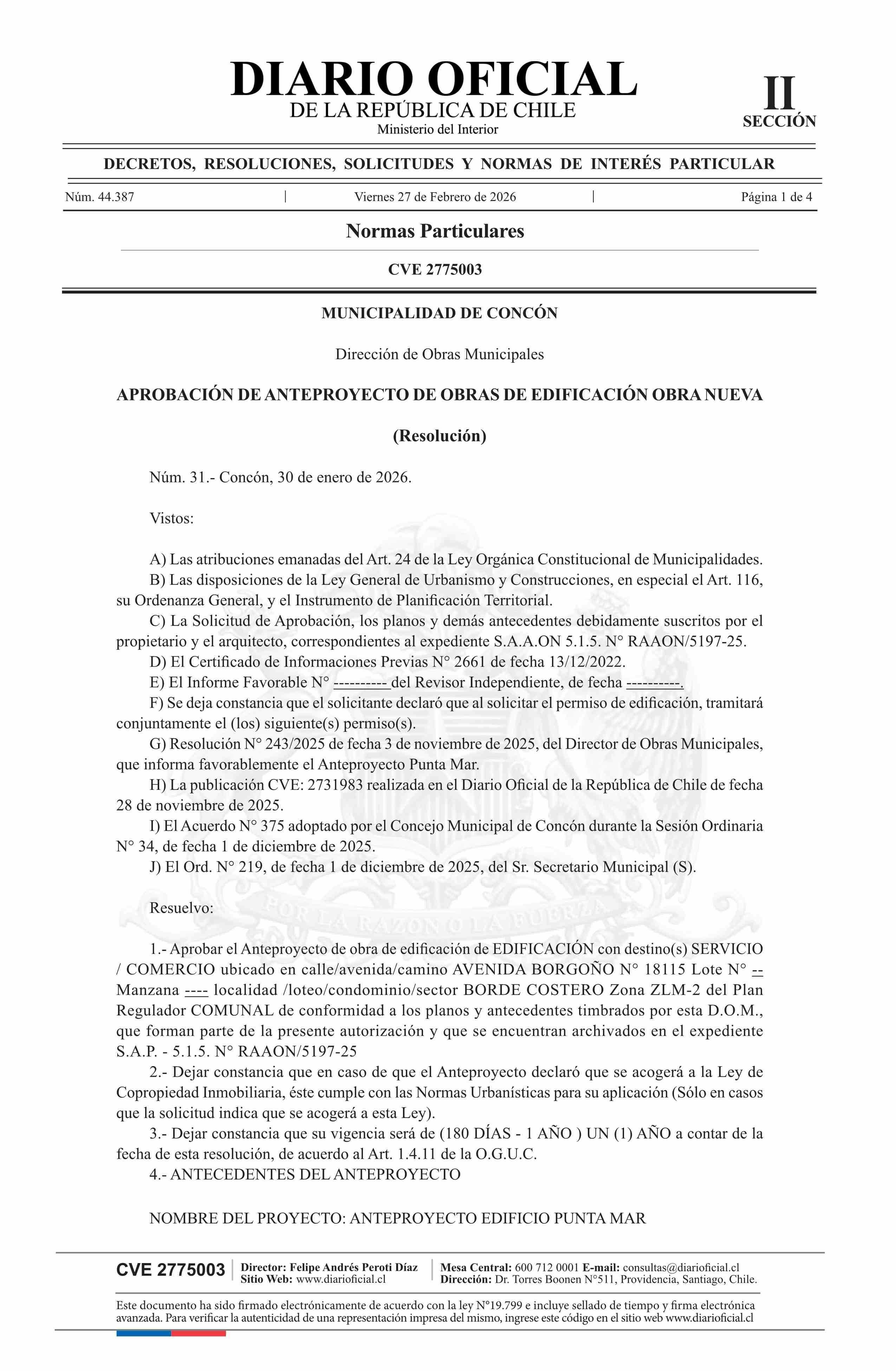 Resolución número 31, de 2026.- Aprueba anteproyecto de obras de edificación