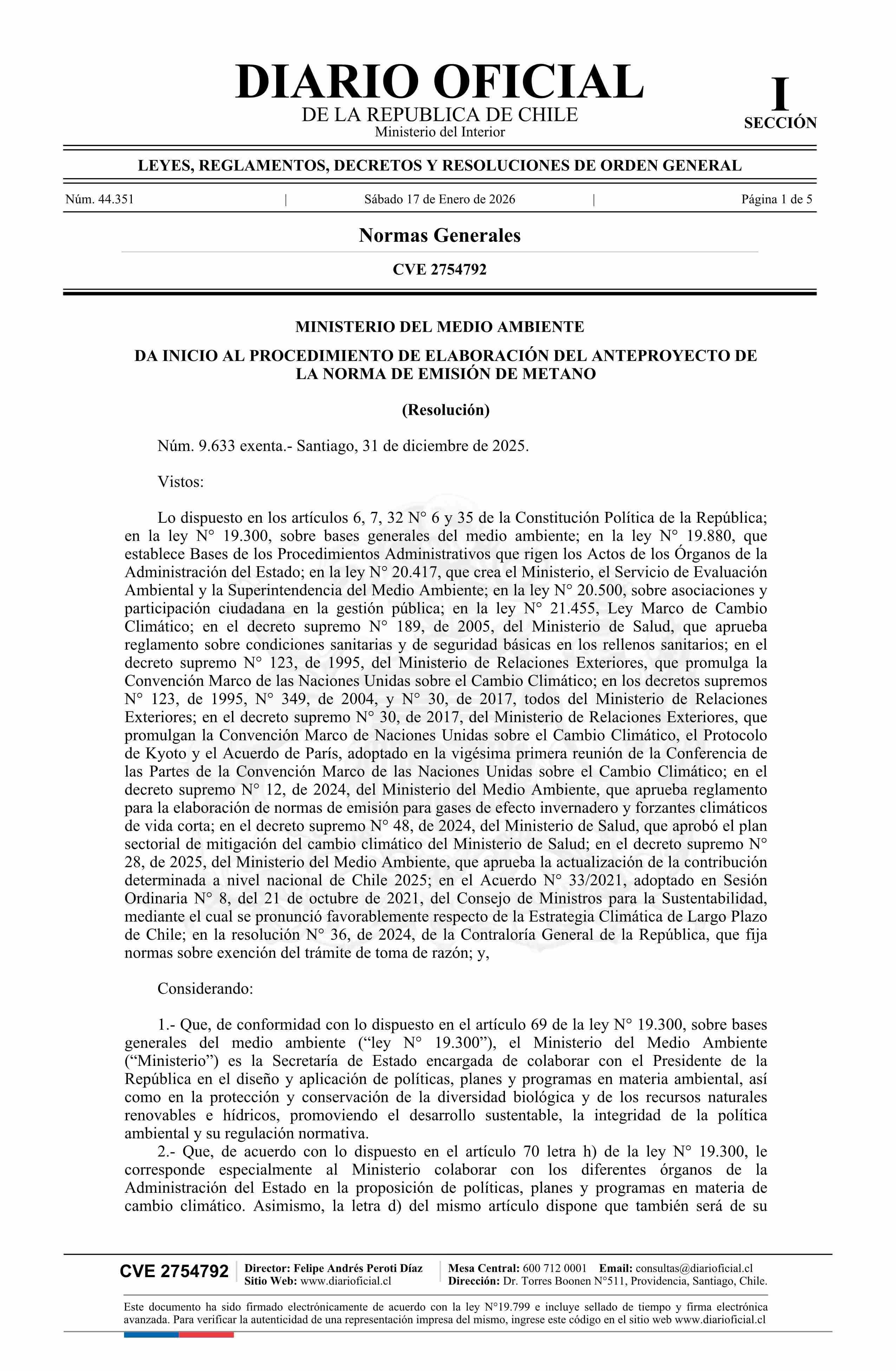 | Título: | Resolución exenta número 9.633, de 2025.- Inicia procedimiento de elaboración del anteproyecto de la norma de emisión de metano |