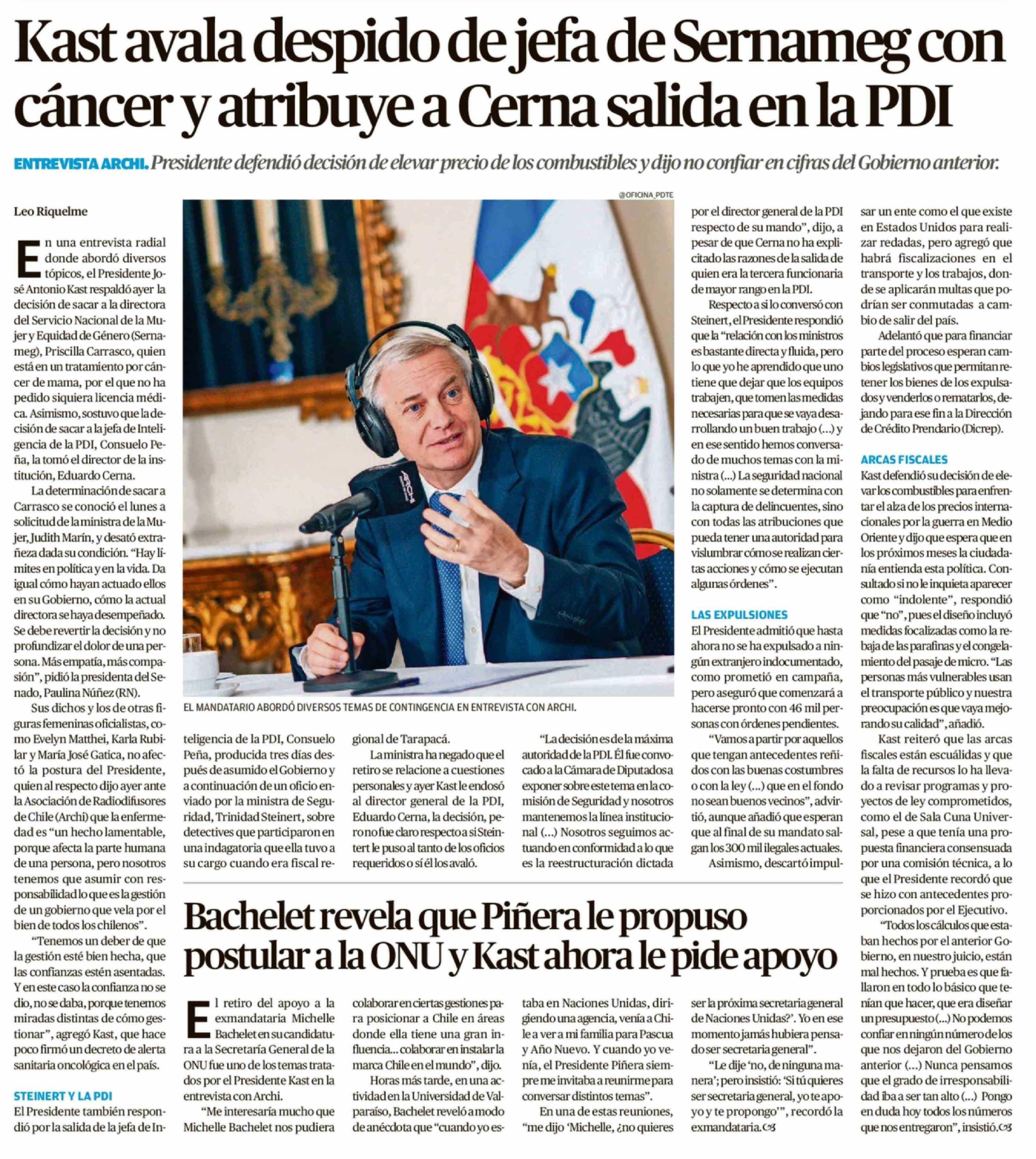 Kast avala despido de jefa de Sernameg con cáncer y atribuye a Cerna salida en la PDI