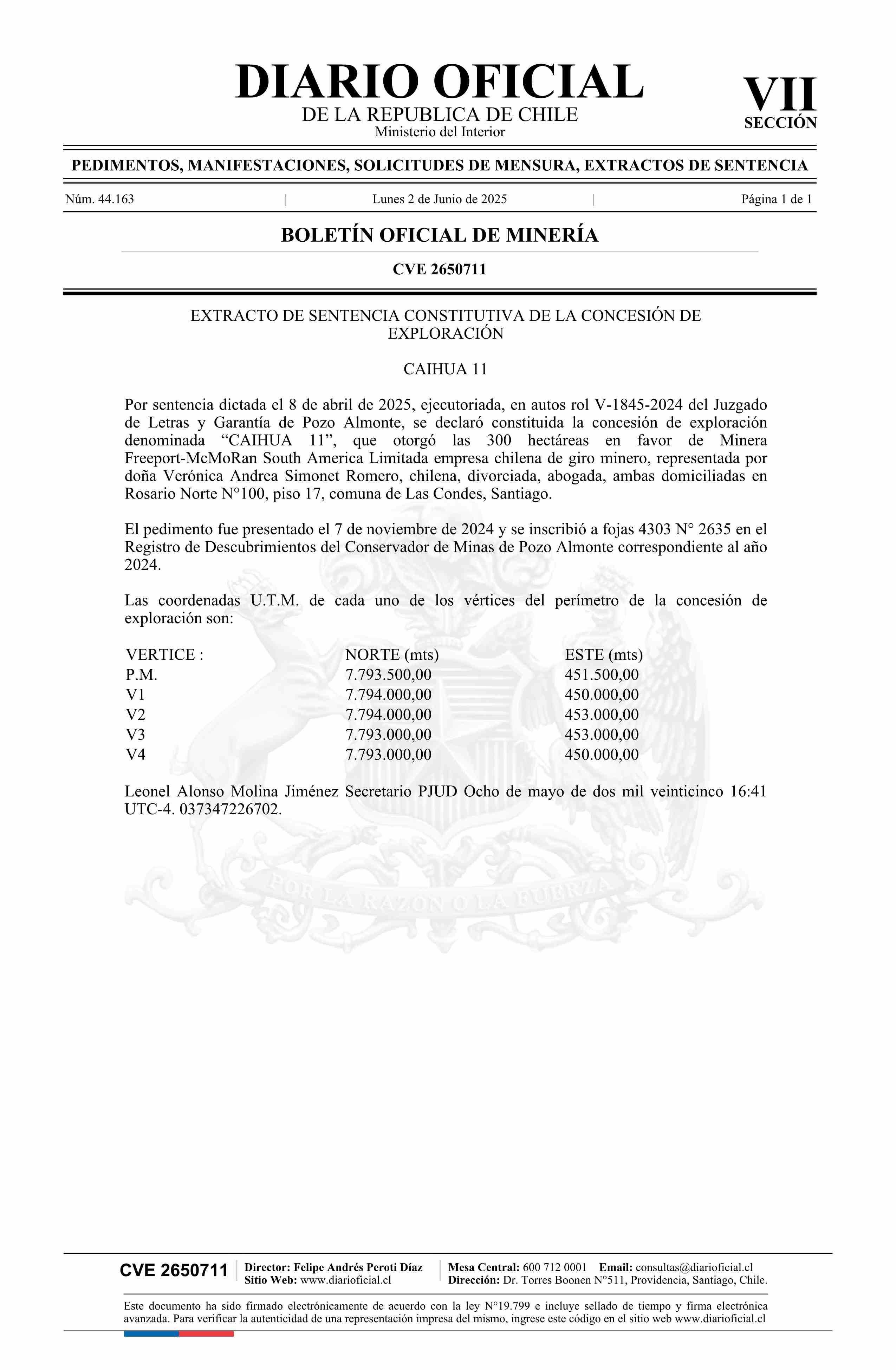 CAIHUA 11 / Minera Freeport-McMoRan South America Limitada