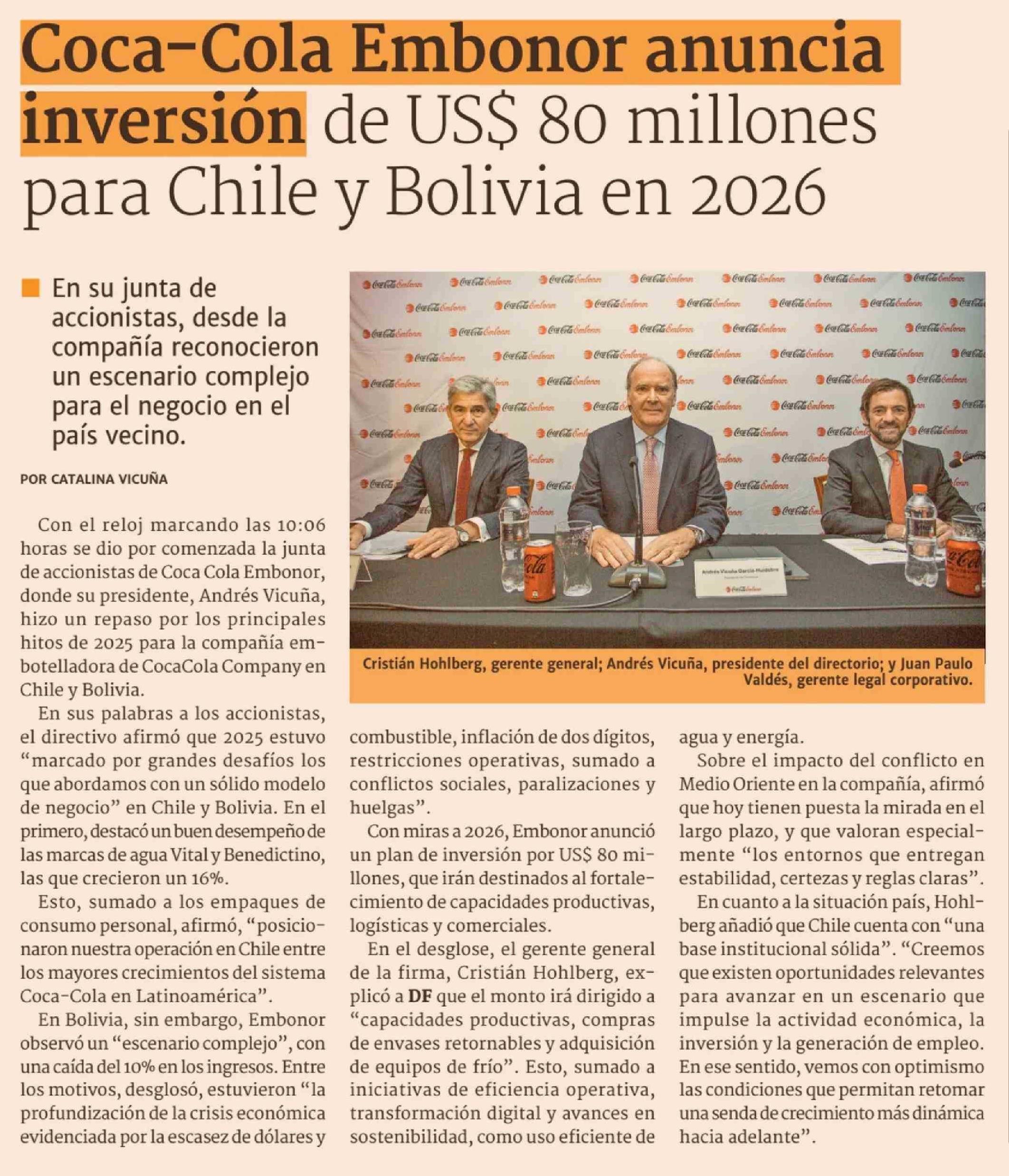 Coca-Cola Embonor anuncia inversión de US$ 80 millones para Chile y Bolivia en 2026