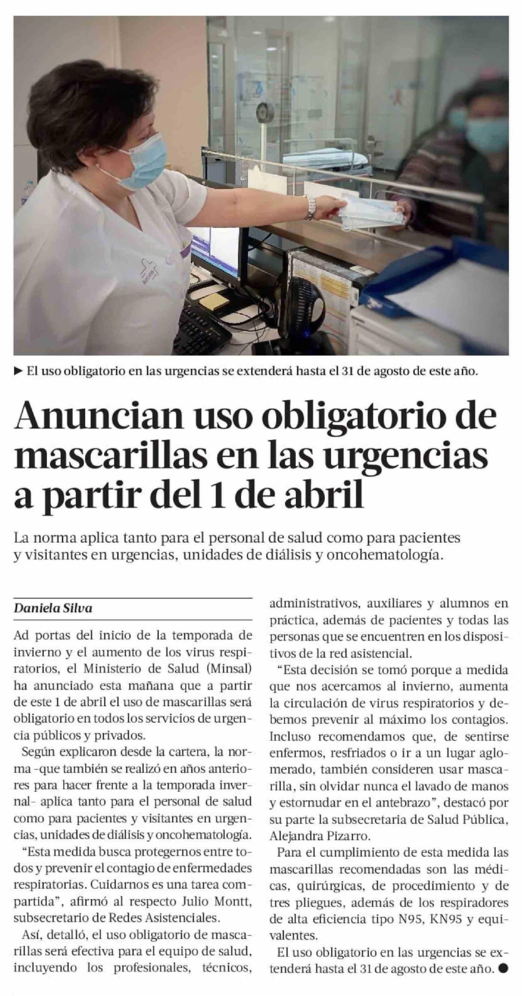 Anuncian uso obligatorio de mascarillas en las urgencias a partir del 1 de abril