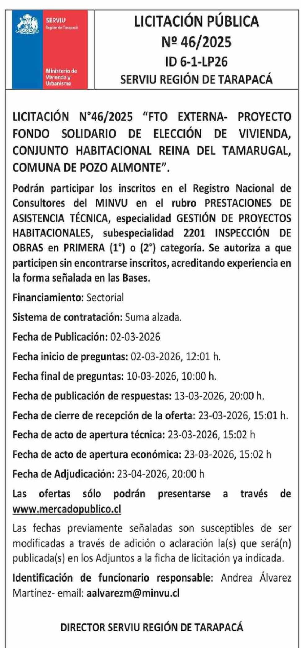 Aviso Licitaciones: LICITACIÓN PÚBLICA Nº 46/2025 ID 6-1-LP26 SERVIU REGIÓN DE TARAPACÁ