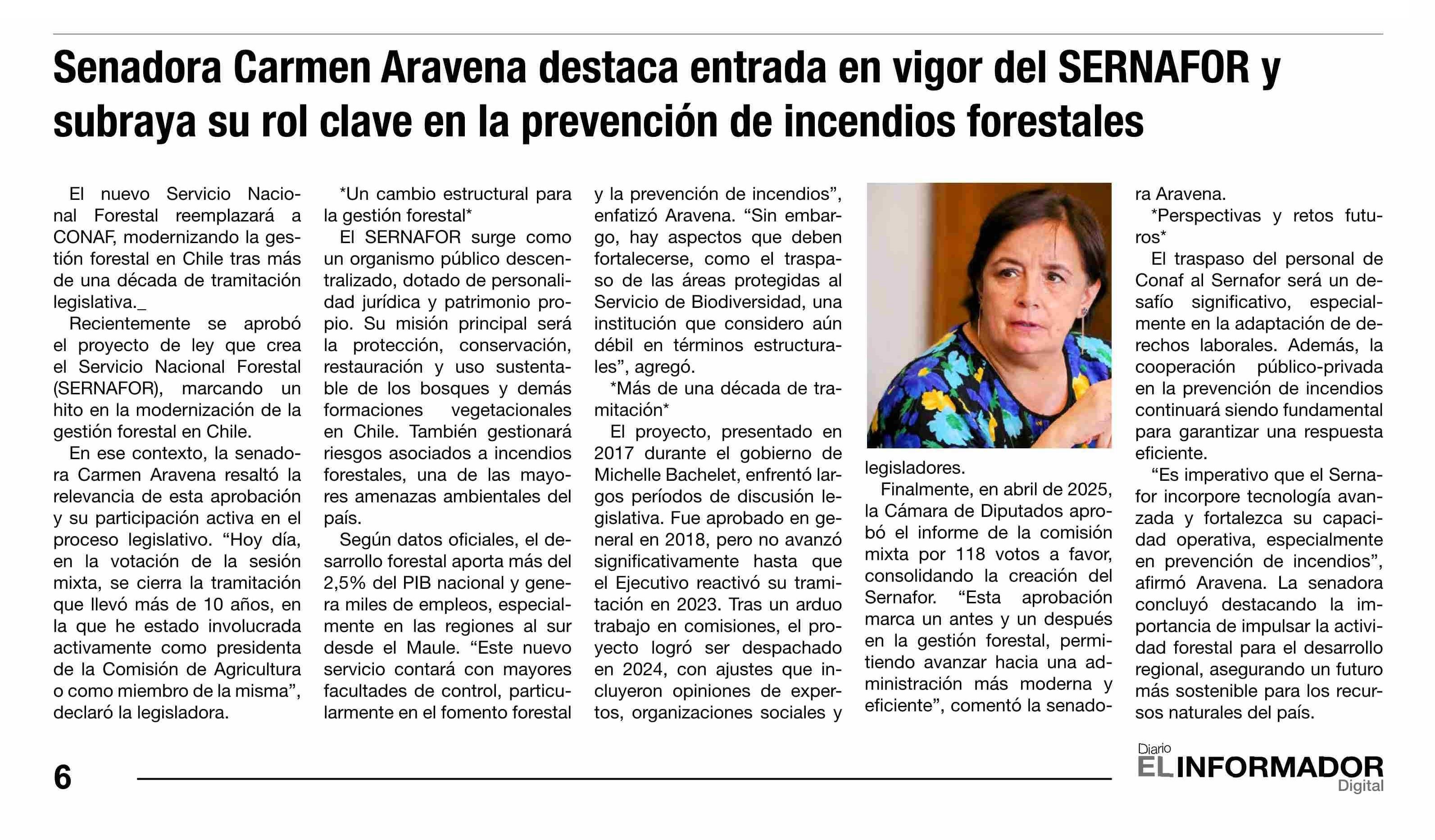 Senadora Carmen Aravena destaca entrada en vigor del SERNAFOR y subraya su rol clave en la prevención de incendios forestales