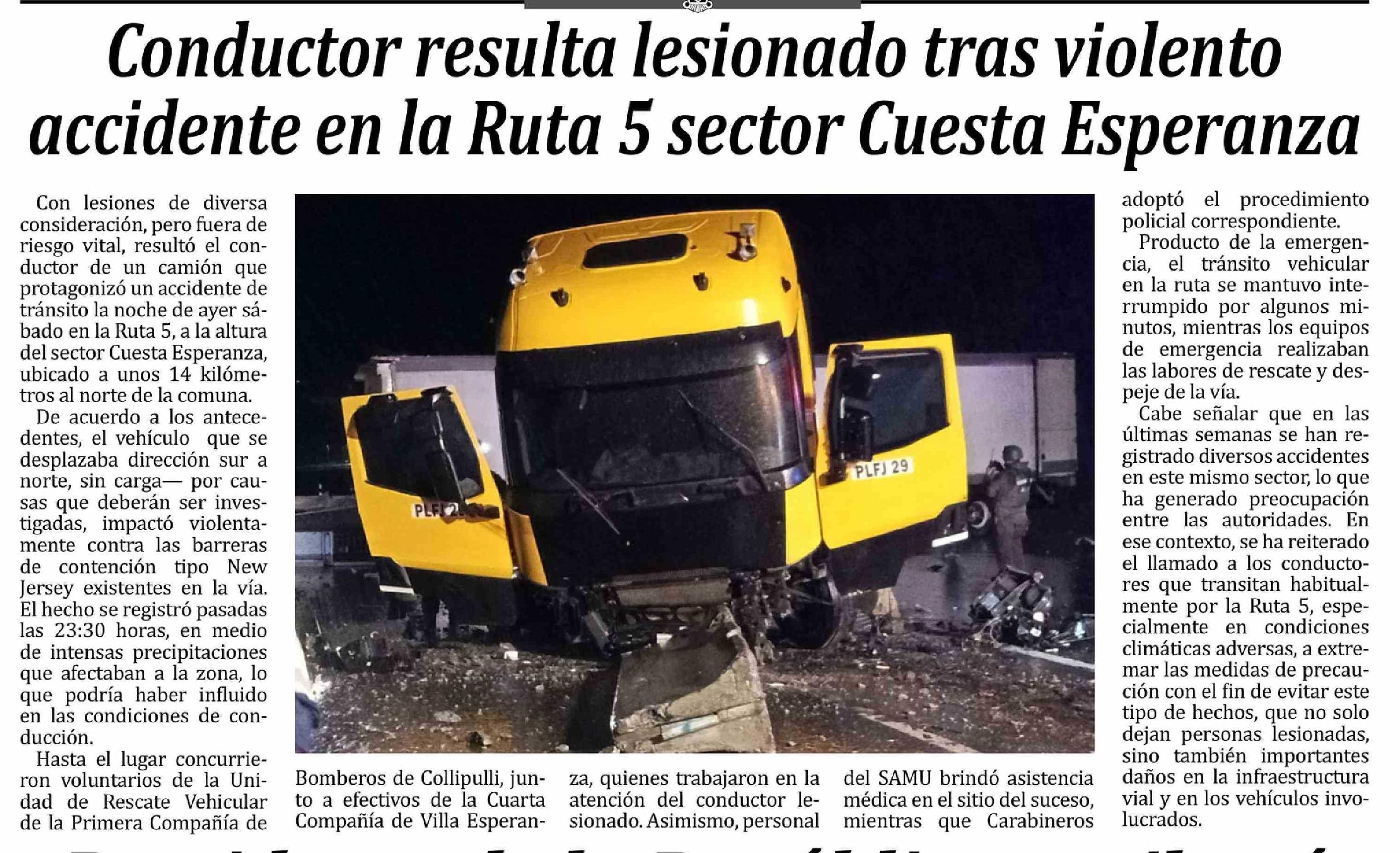 Conductor resulta lesionado tras violento accidente en la Ruta 5 sector Cuesta Esperanza
