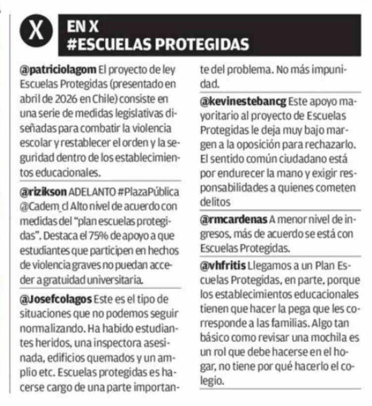 Título: EN X #ESCUELAS PROTEGIDAS te del problema. No más impunidad. @kevinestebancg Este apoyo mayoritario al proyecto de Escuelas Protegidas le deja muy bajo margen a la oposición para rechazarlo. El sentido común ciudadano está por endurecer la mano y exigir responsabilidades a quienes cometen delitos @r