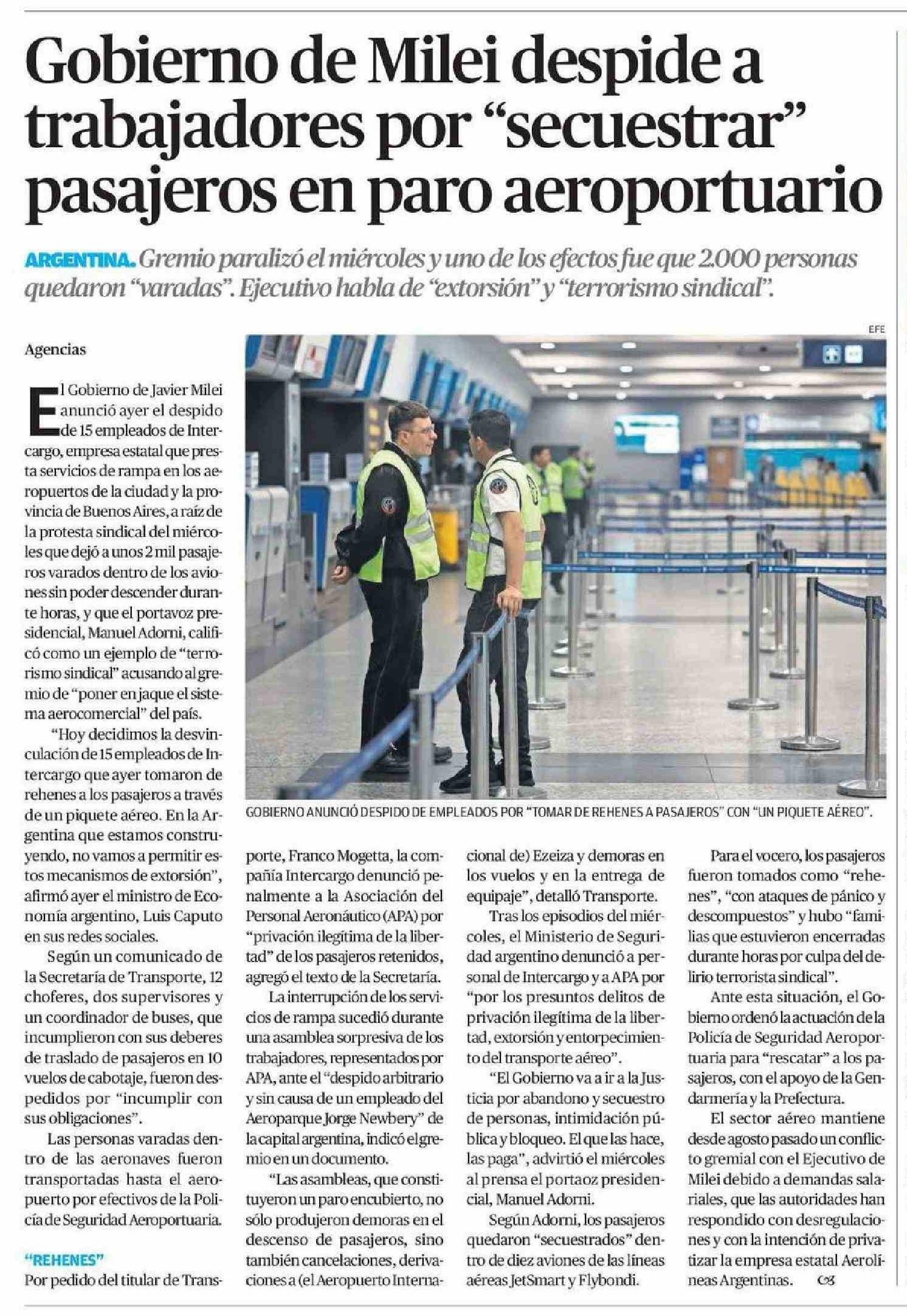 Gobierno de Milei despide a trabajadores por “secuestrar” pasajeros en paro aeroportuario