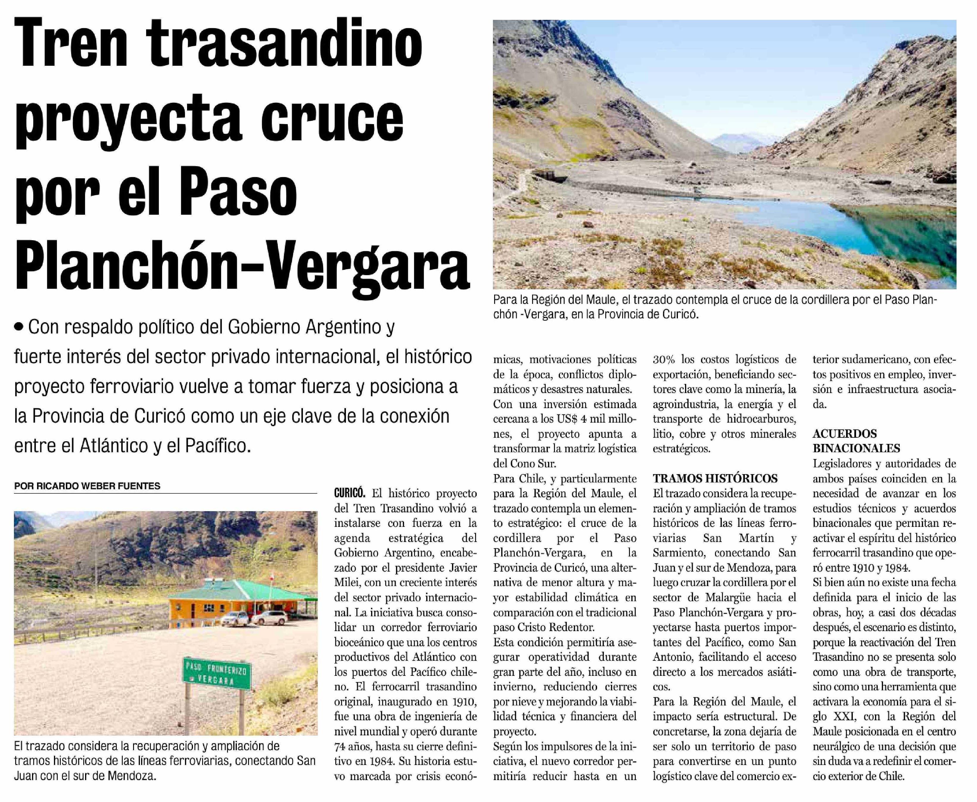 Tren trasandino proyecta cruce por el Paso Planchon-Vergara