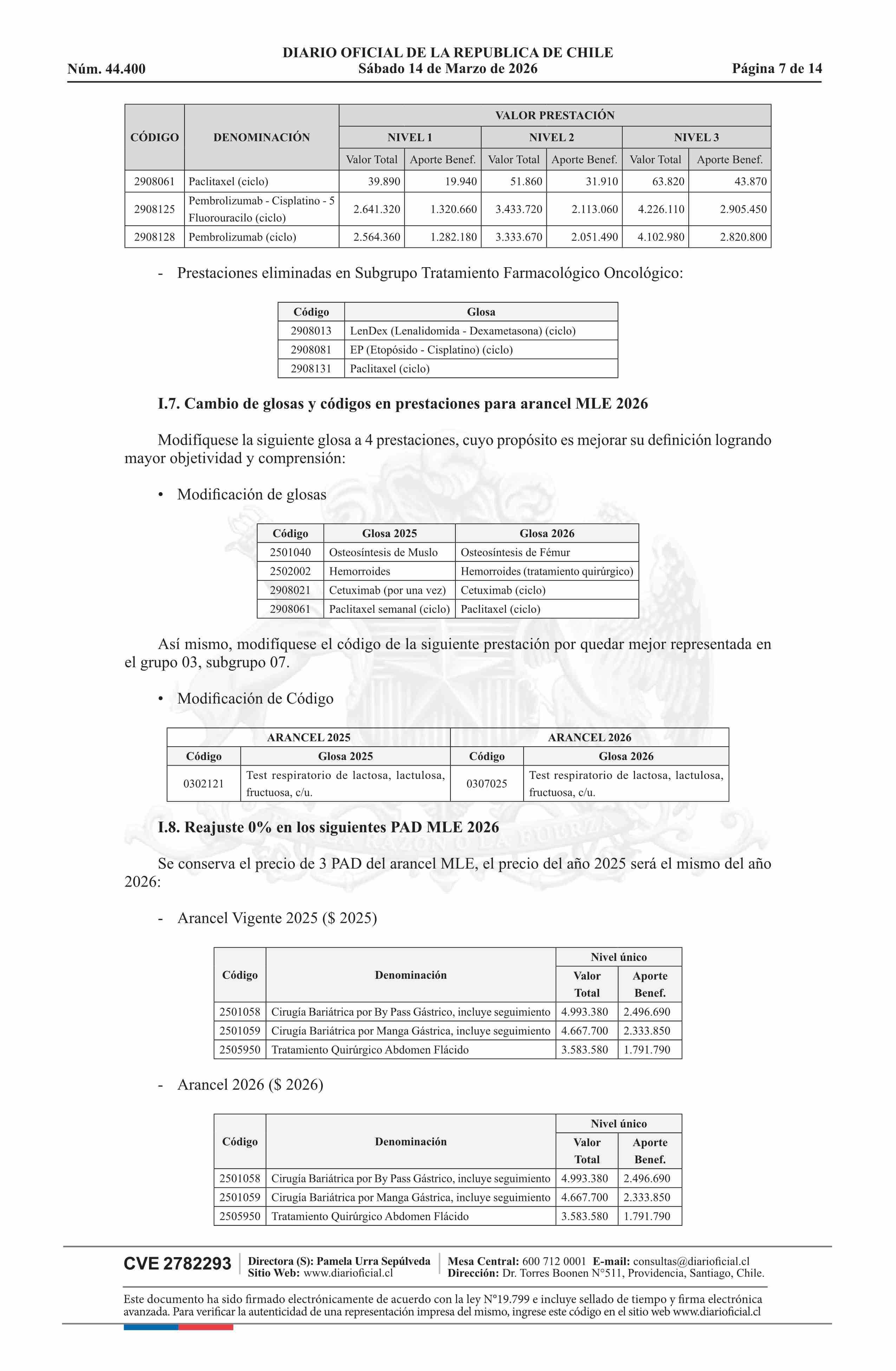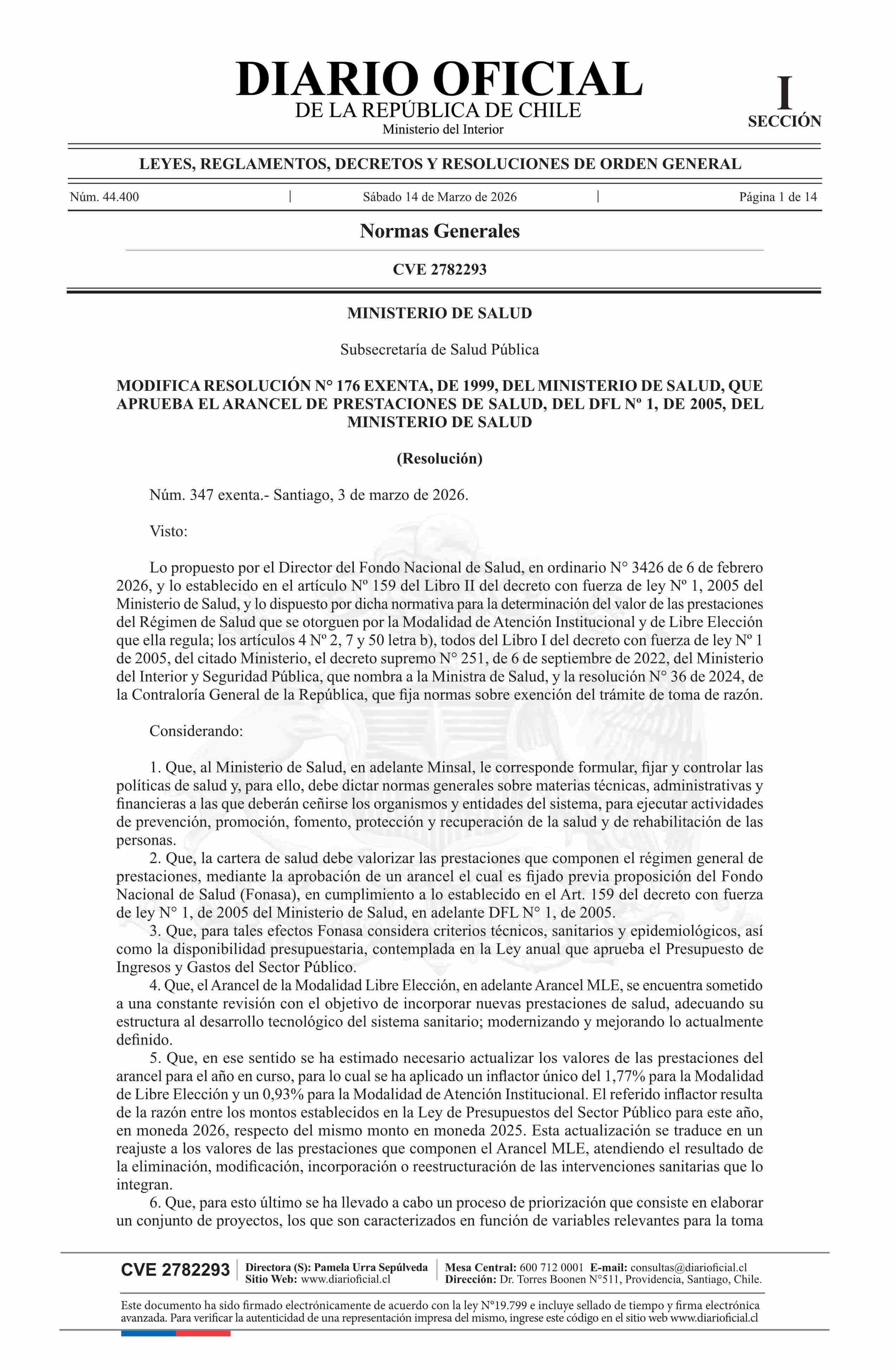 | Título: | Resolución exenta número 347, de 2026.- Modifica resolución N° 176 exenta, de 1999, que aprueba Arancel de Prestaciones de Salud, del decreto con fuerza de ley N° 1, de 2005 |