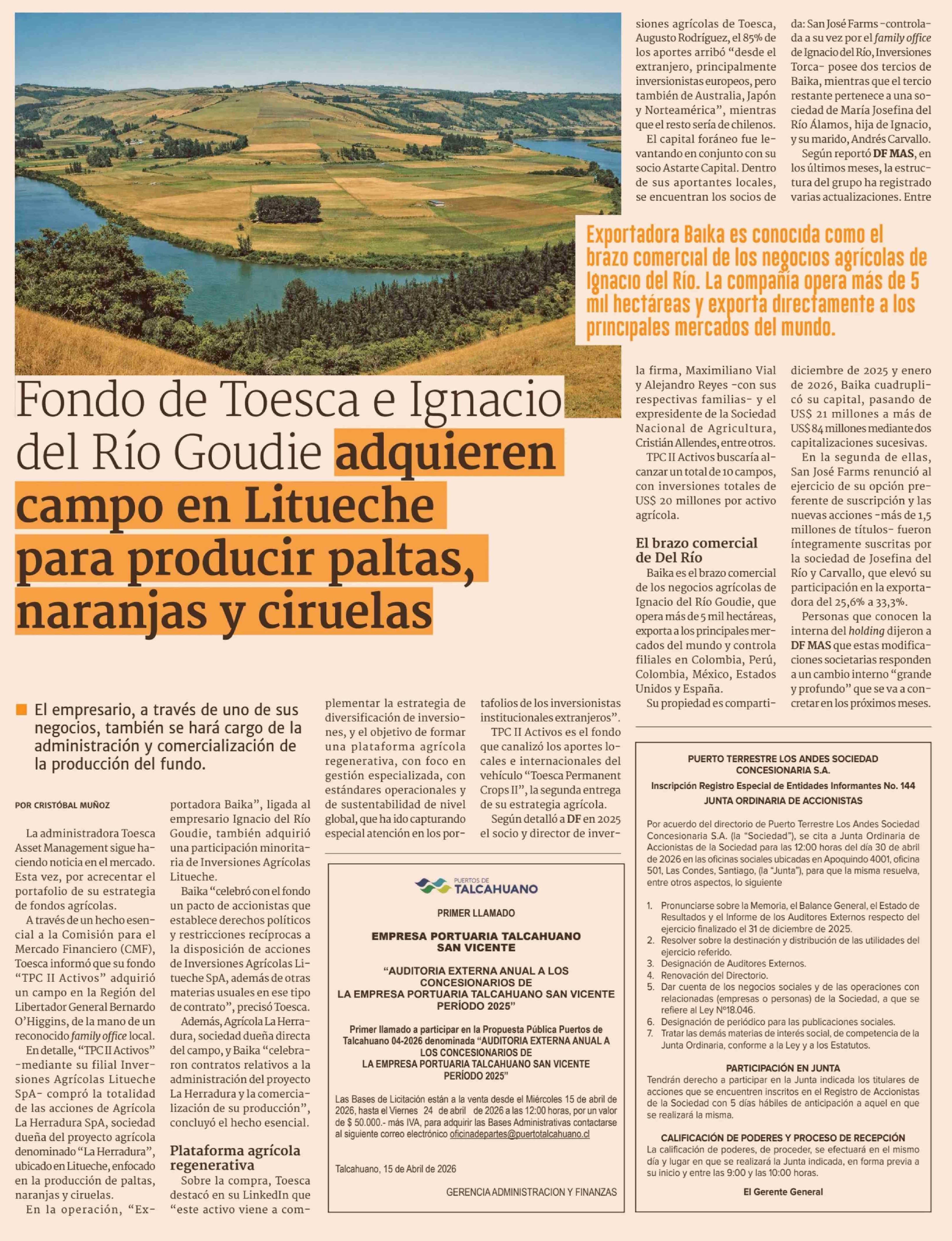 Fondo de Toesca e Ignacio del Río Goudie adquieren campo en Litueche para producir paltas, naranjas y ciruelas