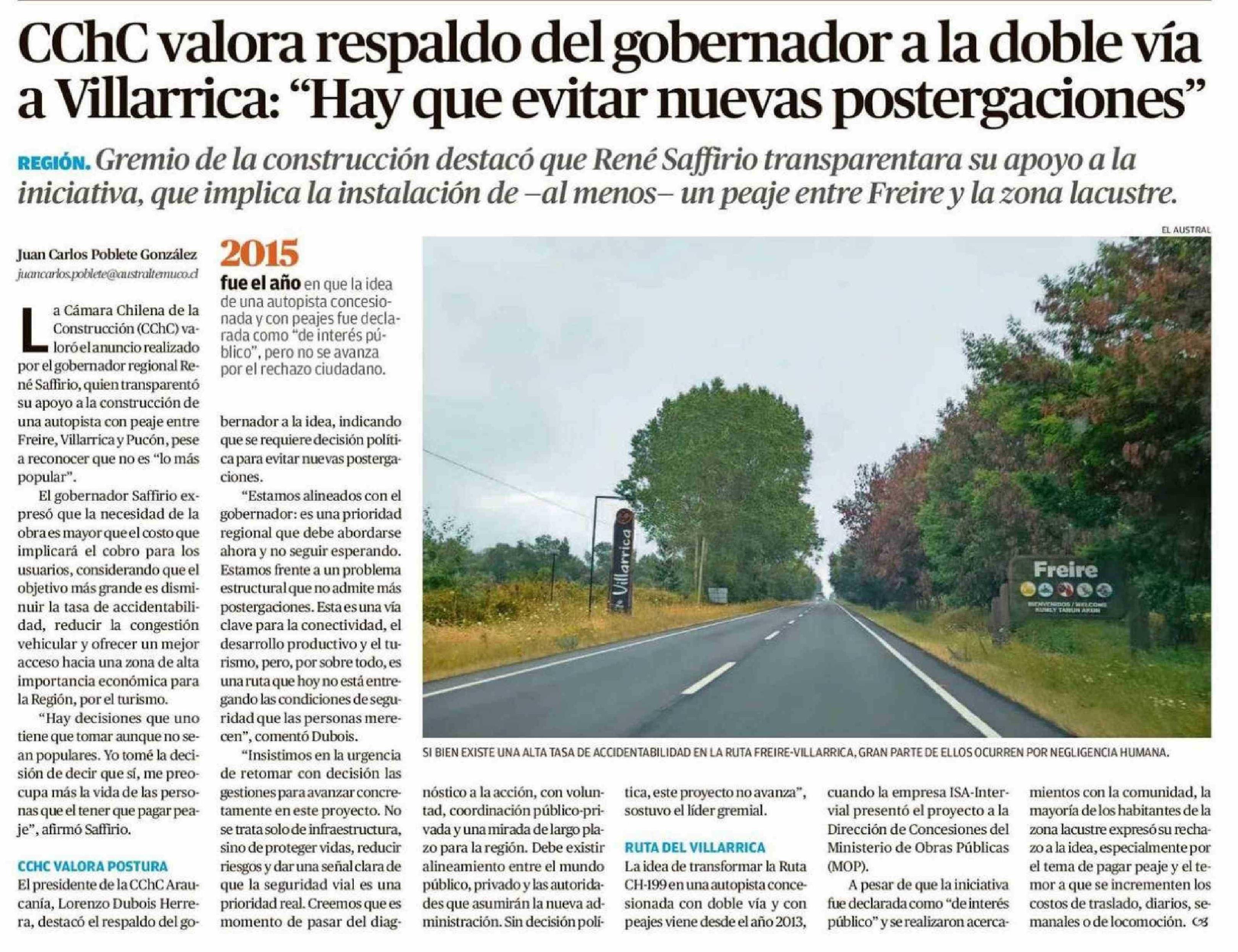 CChC valora respaldo del gobernador a la doble vía a Villarrica: "Hay que evitar nuevas postergaciones"