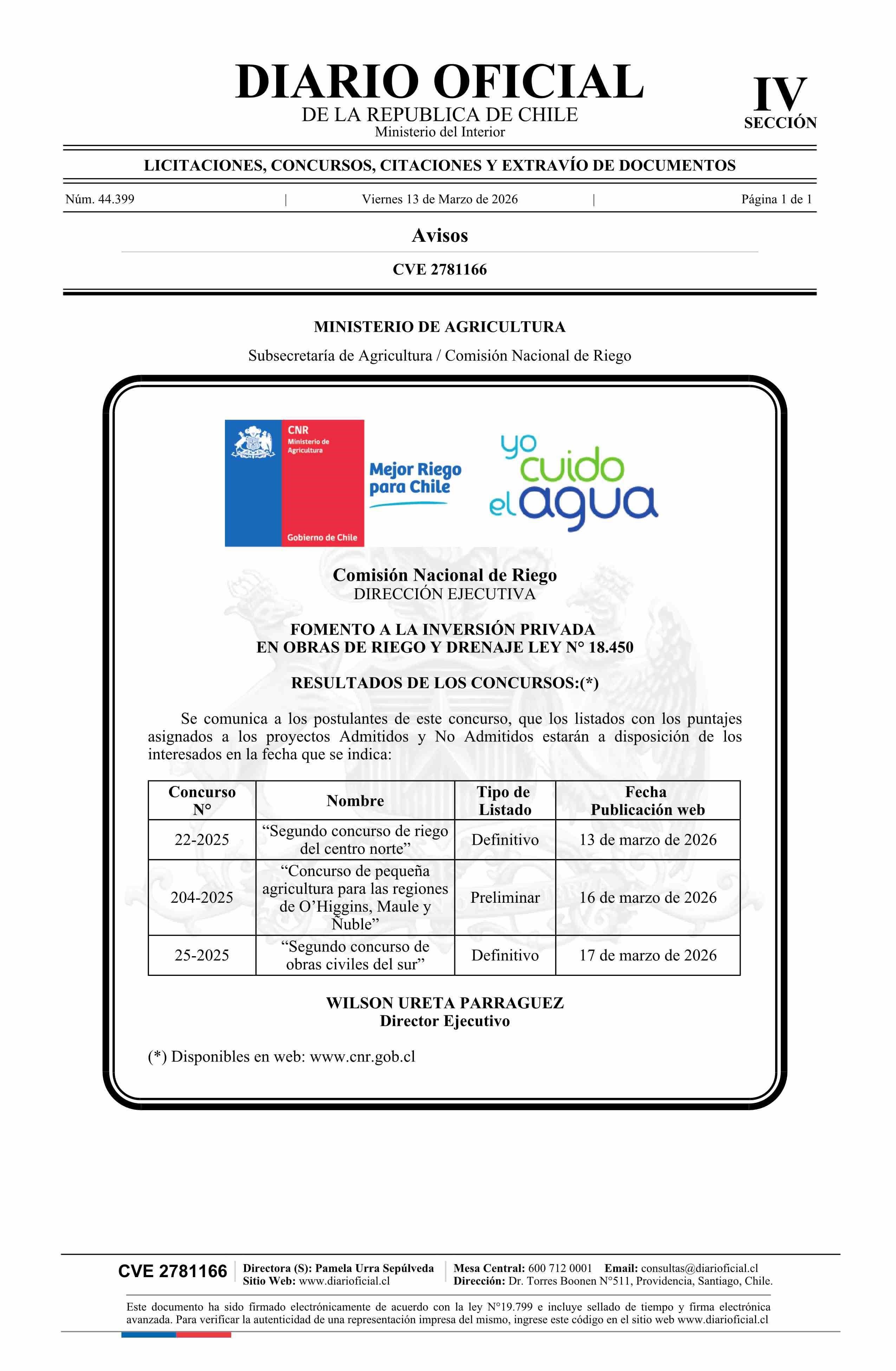 | Título: | AVISO LICITACIONES: Fomento a la inversión privada en obras de riego y drenaje ley N° 18.450 |