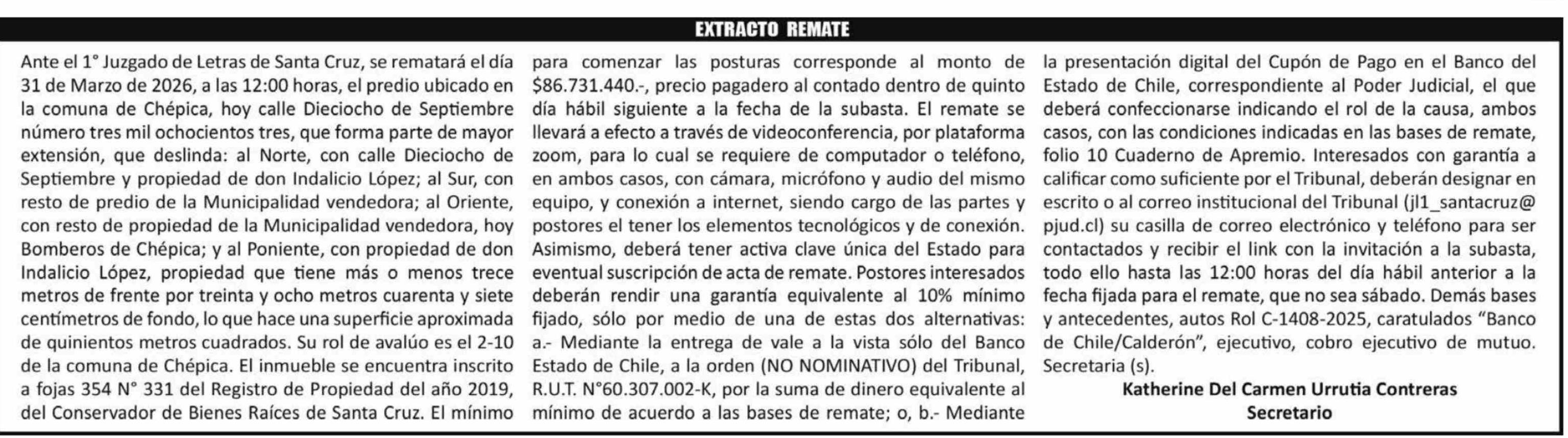 | Título: | Extractos: EXTRACTO REMATE para comenzar las posturas corresponde al monto de la presentación digital del Cupón de Pago en el Banco del $86.731.440 .- , precio pagadero al contado dentro de quinto Estado de Chile, correspondiente al Poder Judicial, el que Ante el 1° Juzgado de Letras de Santa Cruz, |