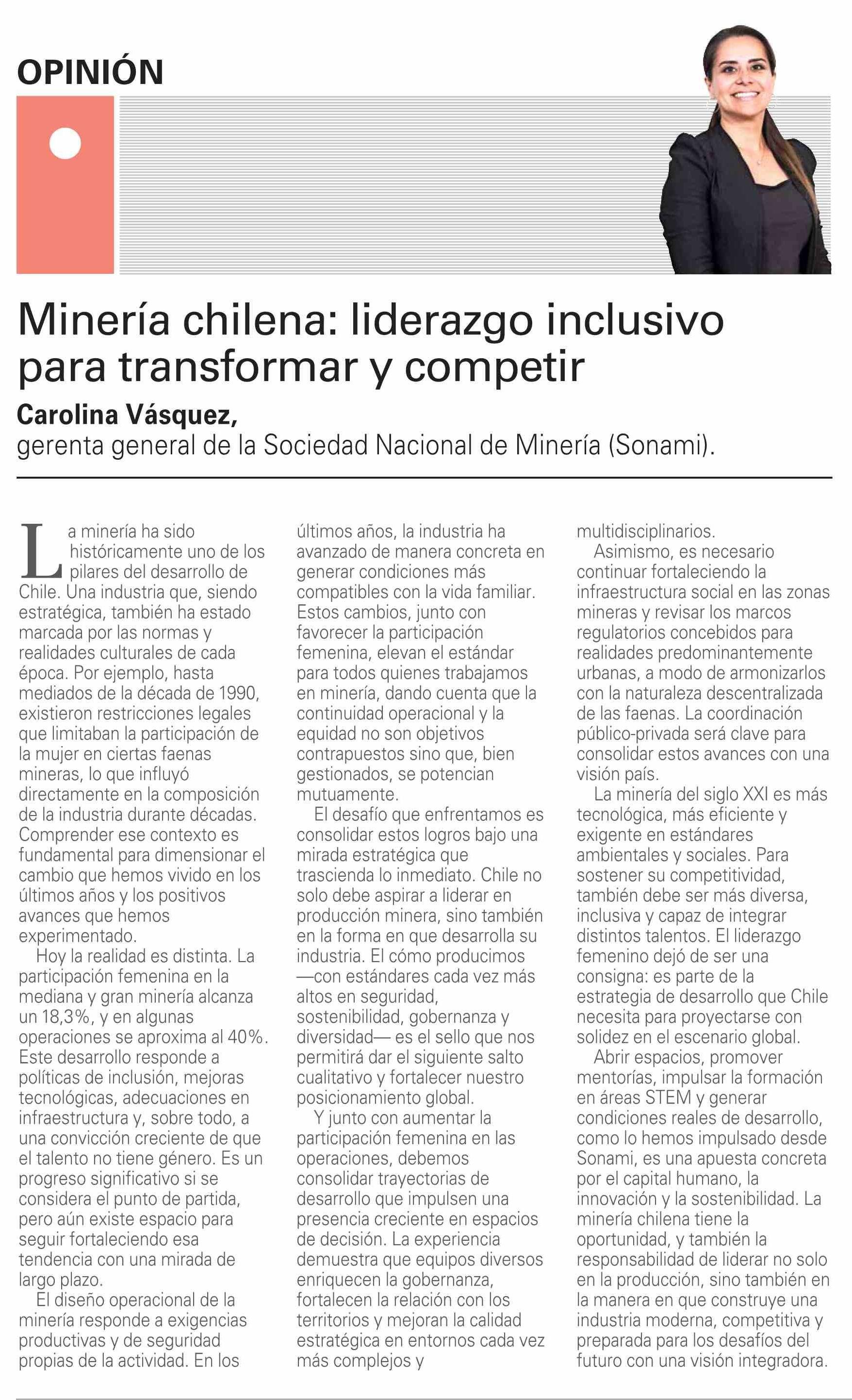 Columnas de Opinión: Minería chilena: liderazgo inclusivo para transformar y competir