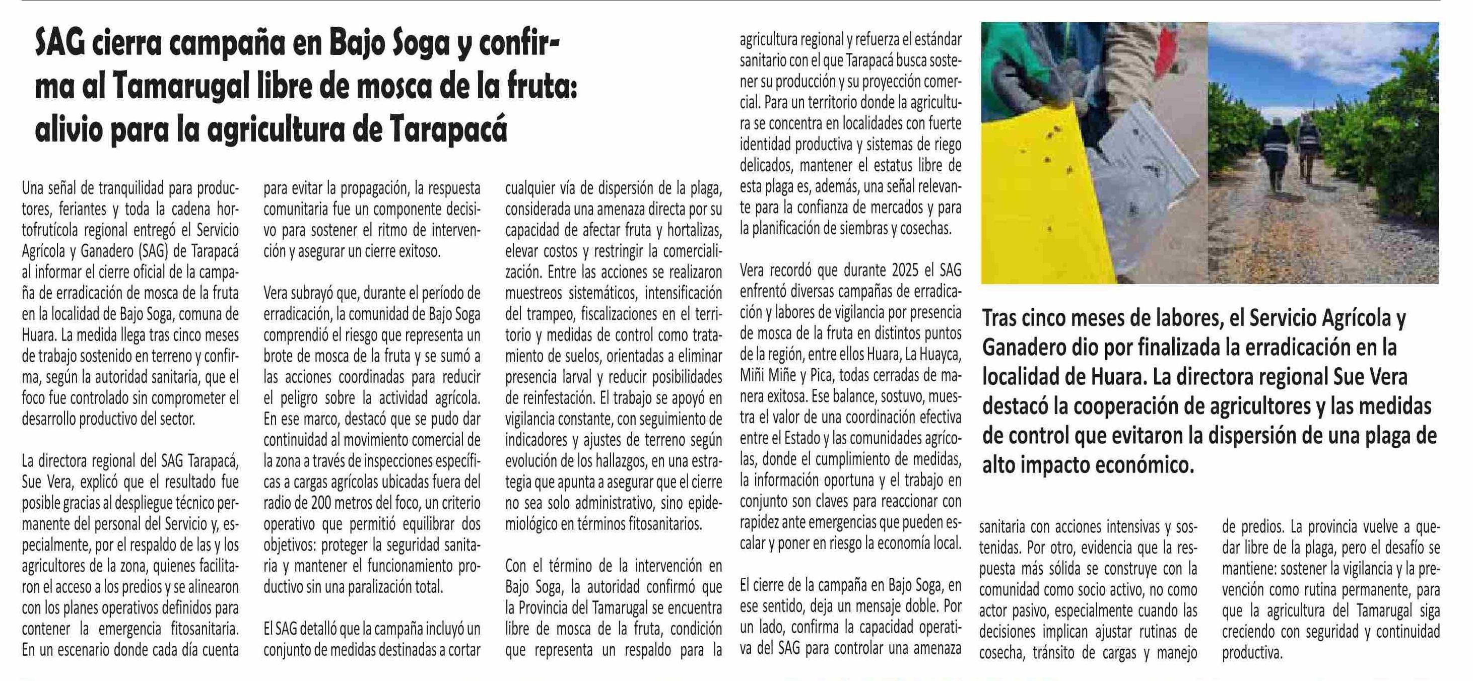 SAG cierra campaña en Bajo Soga y confirma al Tamarugal libre de mosca de la fruta: alivio para la agricultura de Tarapacá