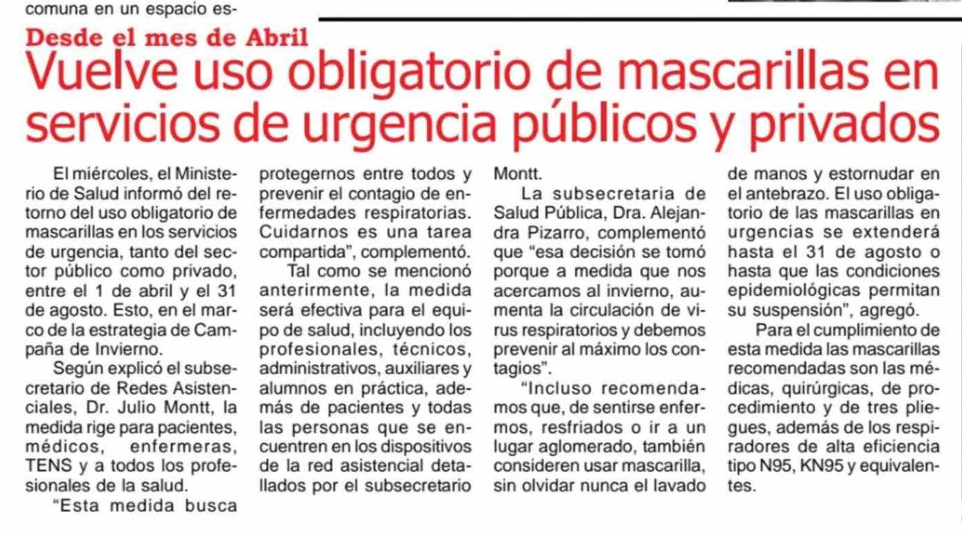 Título: Vuelve uso obligatorio de mascarillas en servicios de urgencia públicos y privados