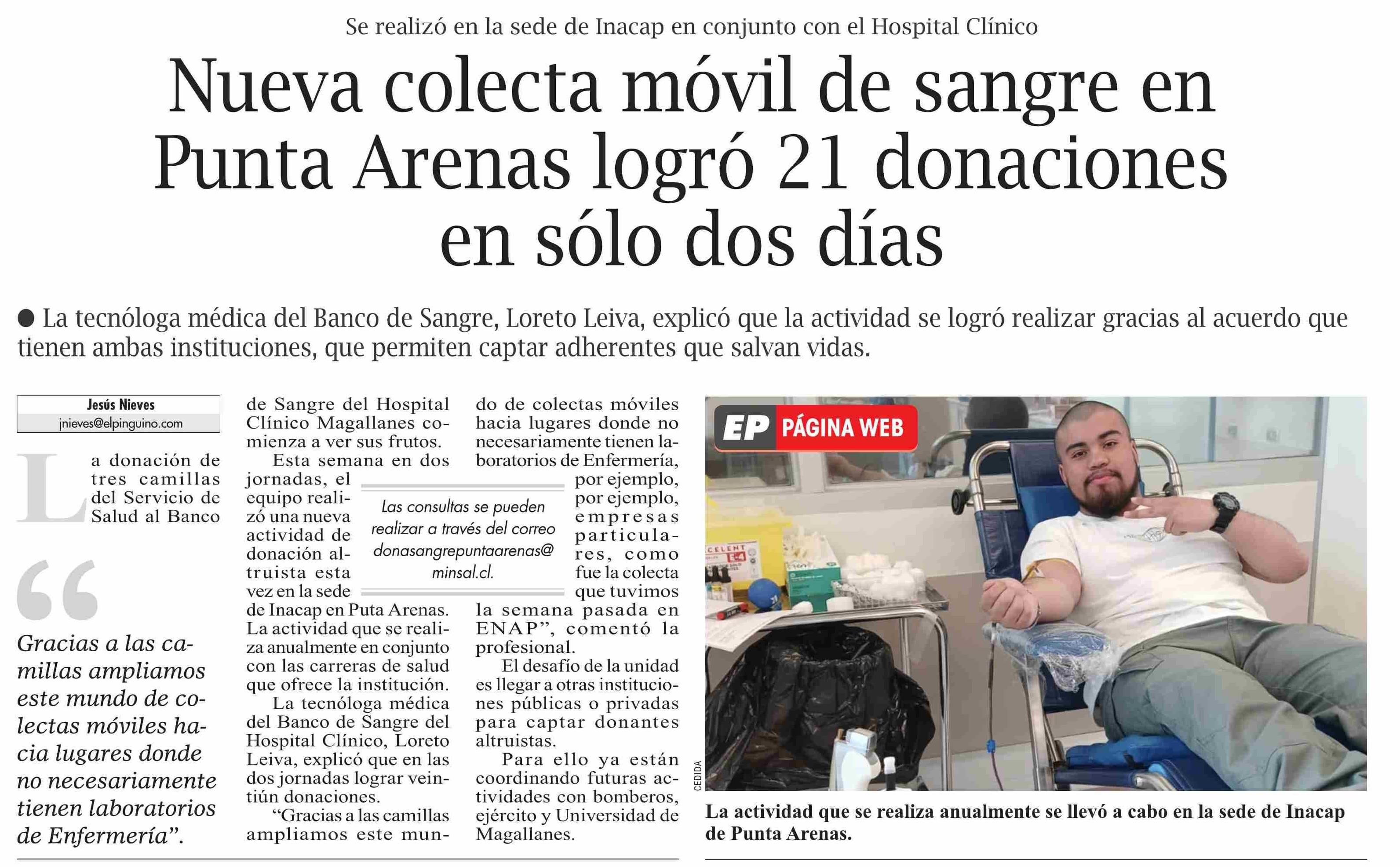 Título: Nueva colecta móvil de sangre en Punta Arenas logró 21 donaciones en sólo dos días