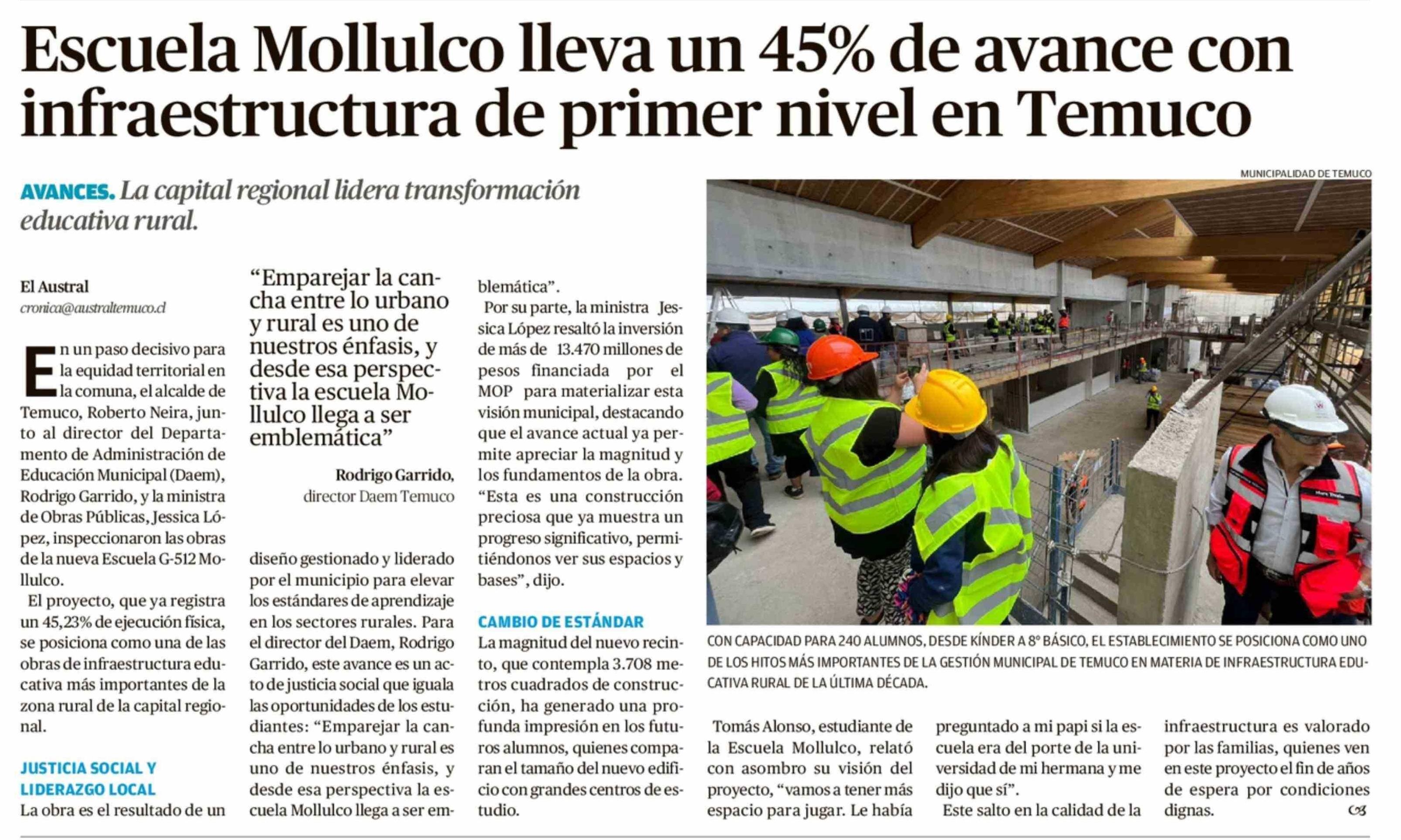 Escuela Mollulco lleva un 45% de avance con infraestructura de primer nivel en Temuco