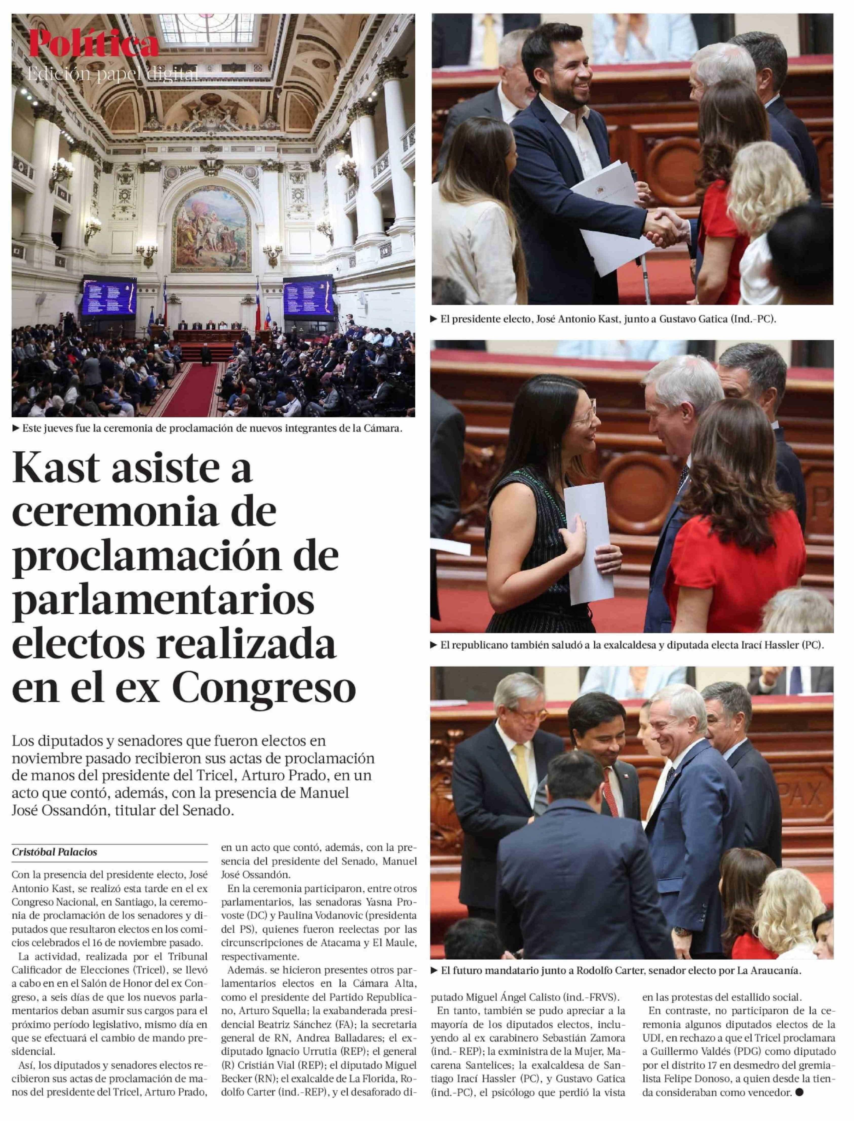Kast asiste a ceremonia de proclamación de parlamentarios electos realizada en el ex Congreso