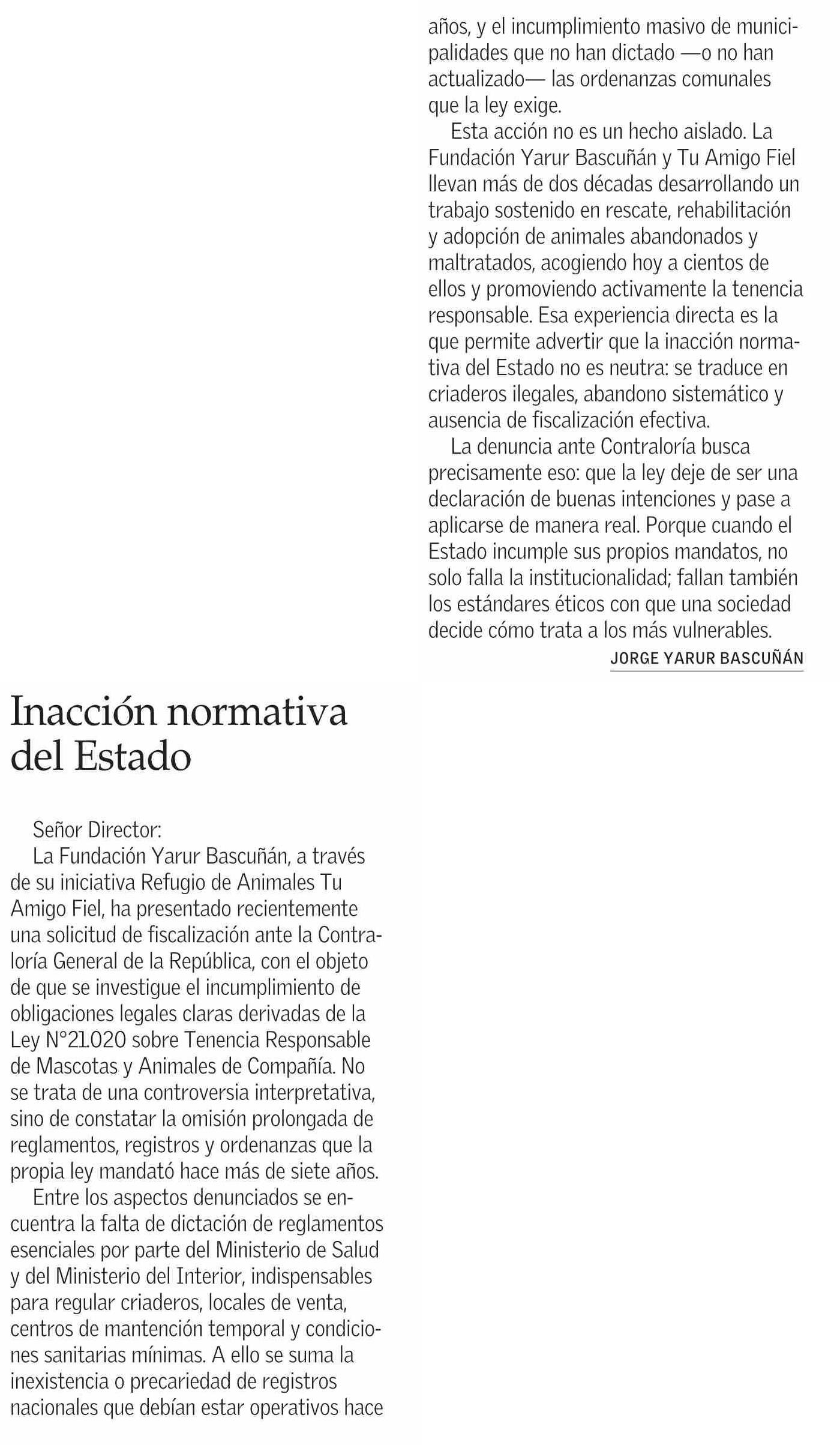 Cartas: Inacción normativa del Estado