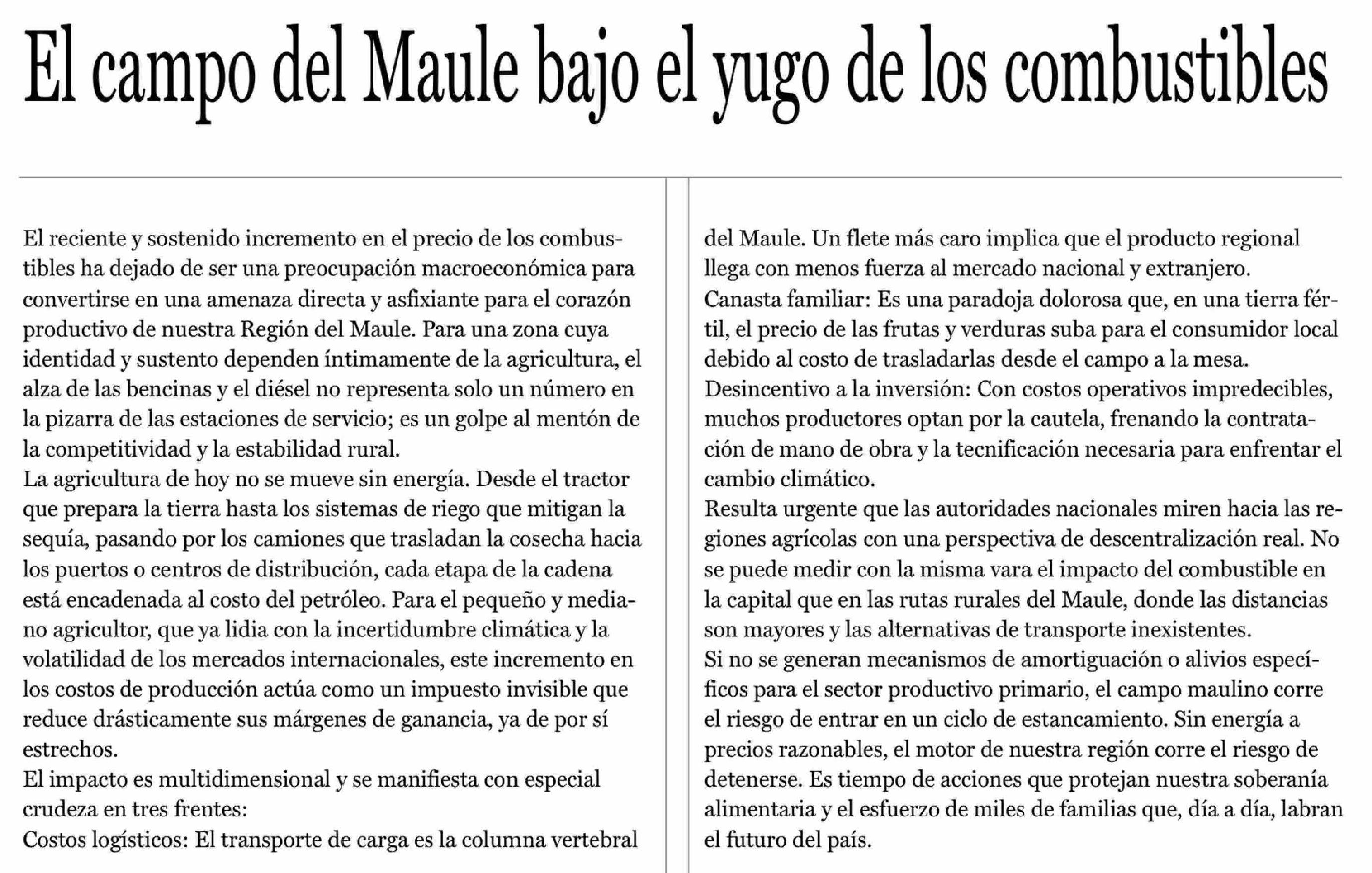 Editorial: El campo del Maule bajo el yugo de los combustibles
