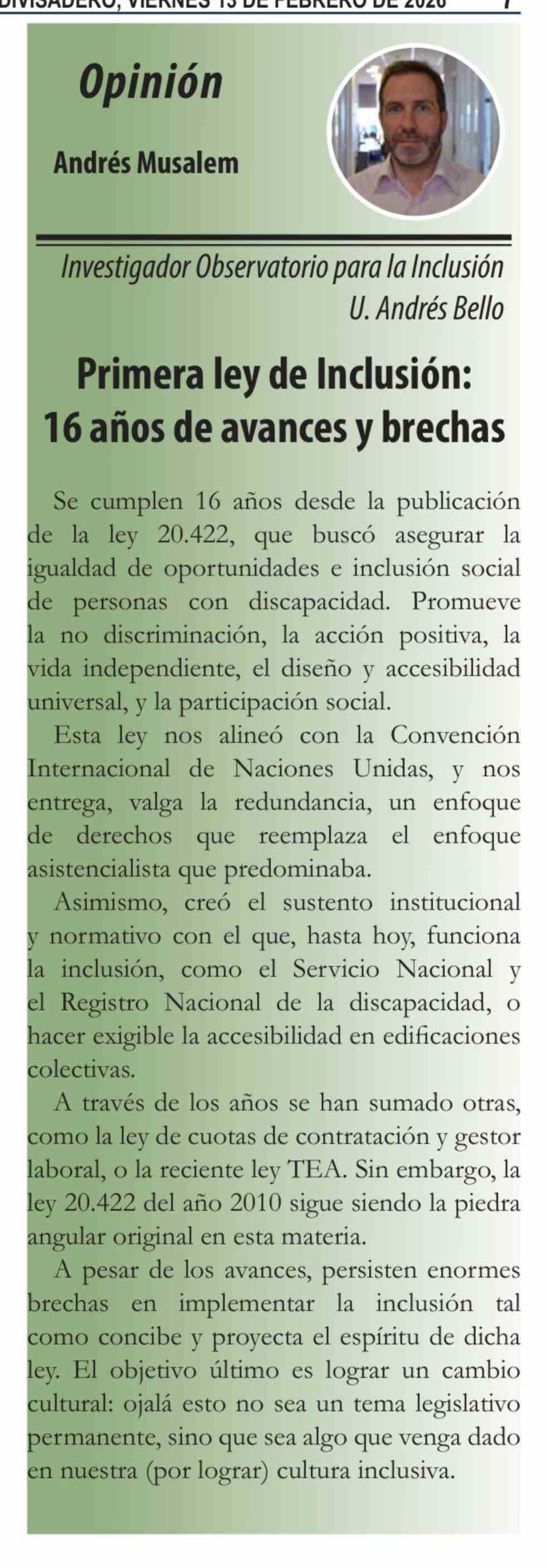Columnas de Opinión: Primera ley de Inclusión: 16 años de avances y brechas