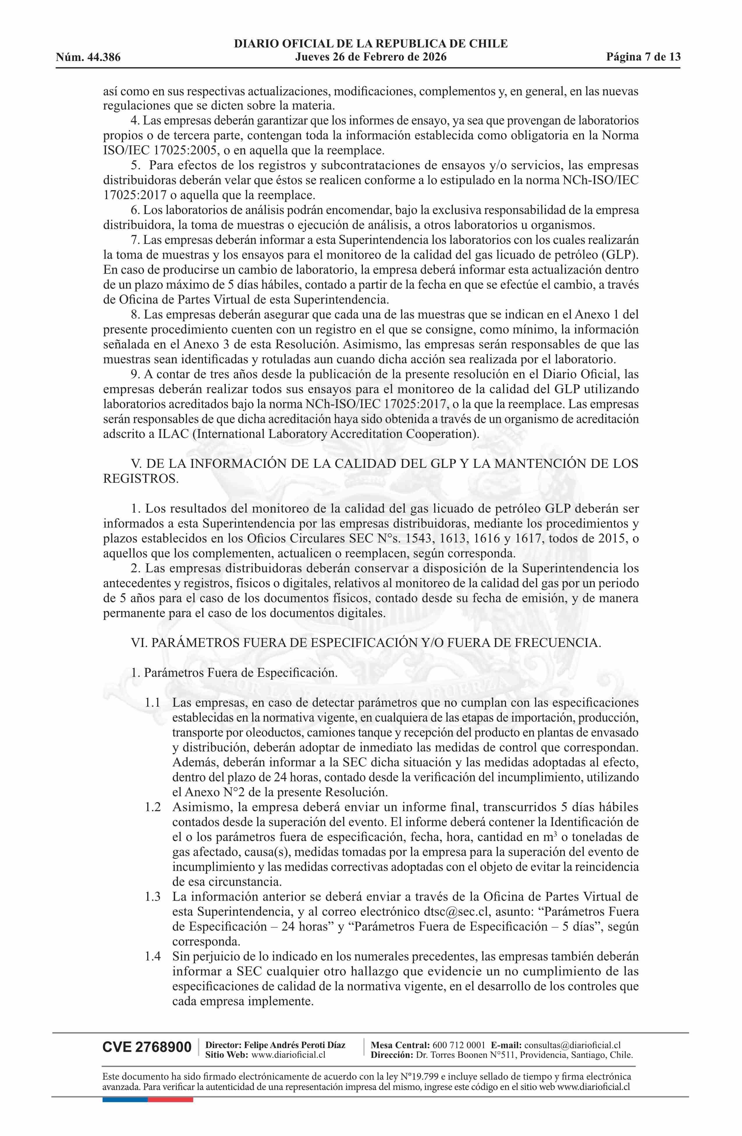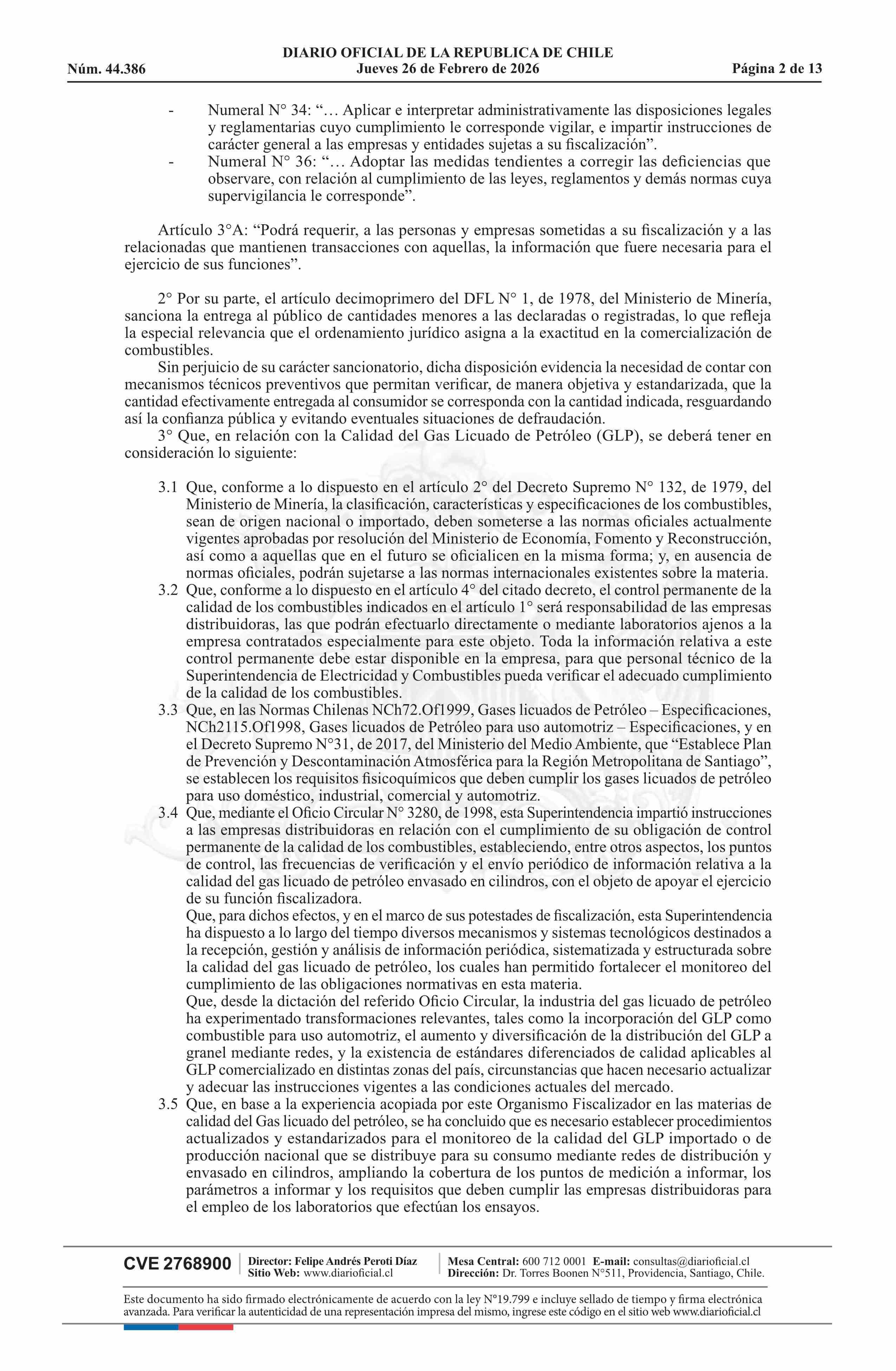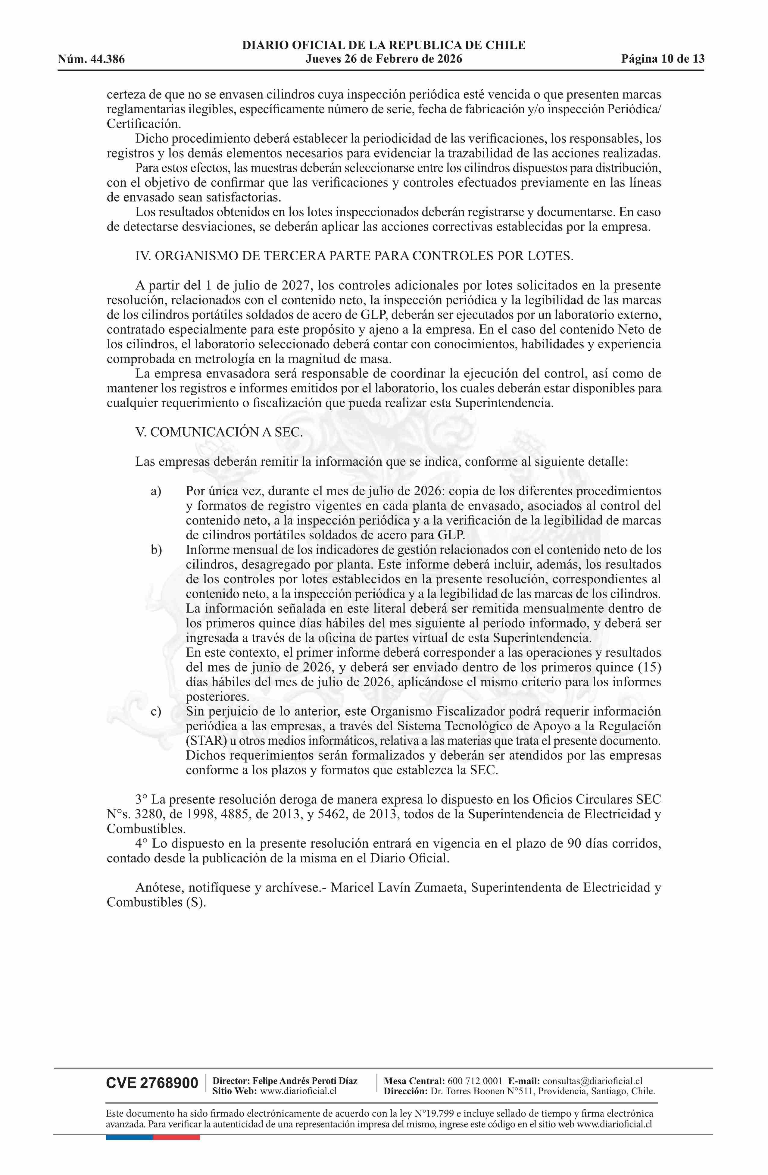 | Título: | Resolución exenta número 37.486, de 2026.- Establece procedimiento para el monitoreo de la calidad del gas licuado de petróleo e instruye requisitos en materias relativas al contenido neto e inspección periódica de cilindros portátiles de GLP |