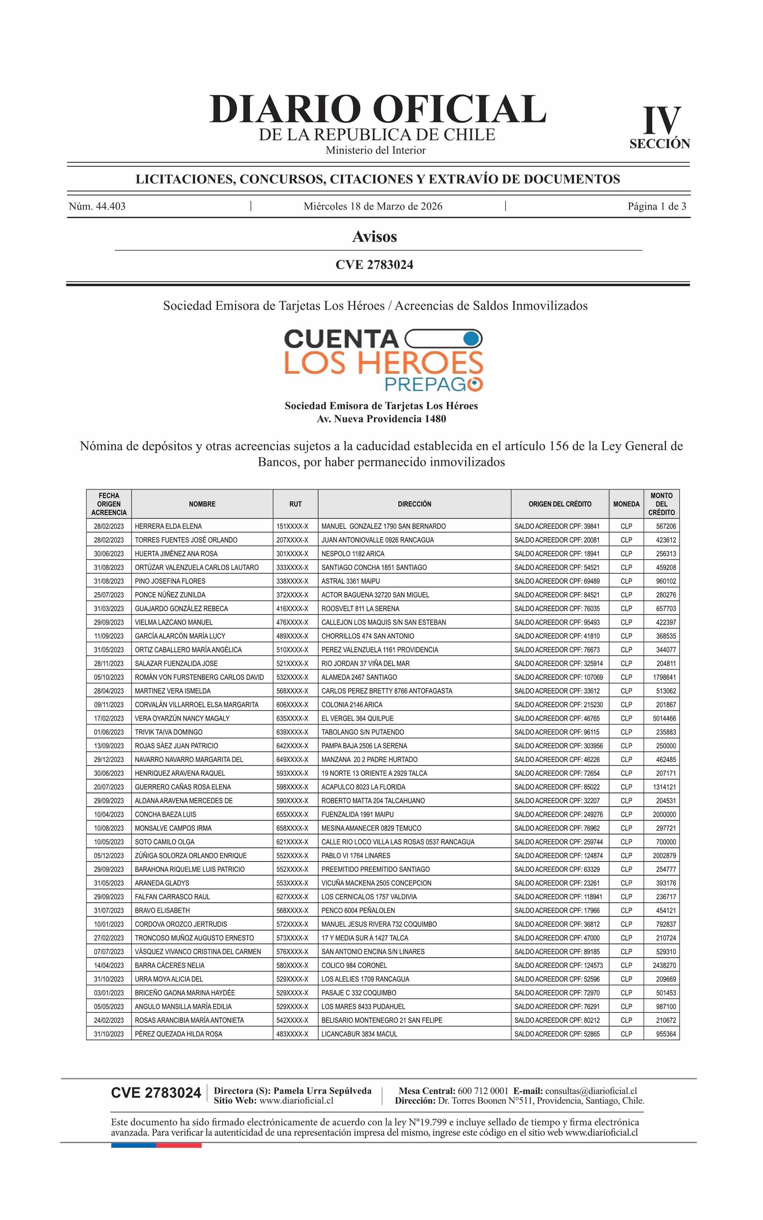 | Título: | AVISO LICITACIONES: SOCIEDAD EMISORES DE TARJETAS PREPAGO LOS HEROES S.A.: Nómina de depósitos y otras acreencias sujetos a la caducidad establecida en el artículo 156 de la Ley General de Bancos, por haber permanecido inmovilizados |