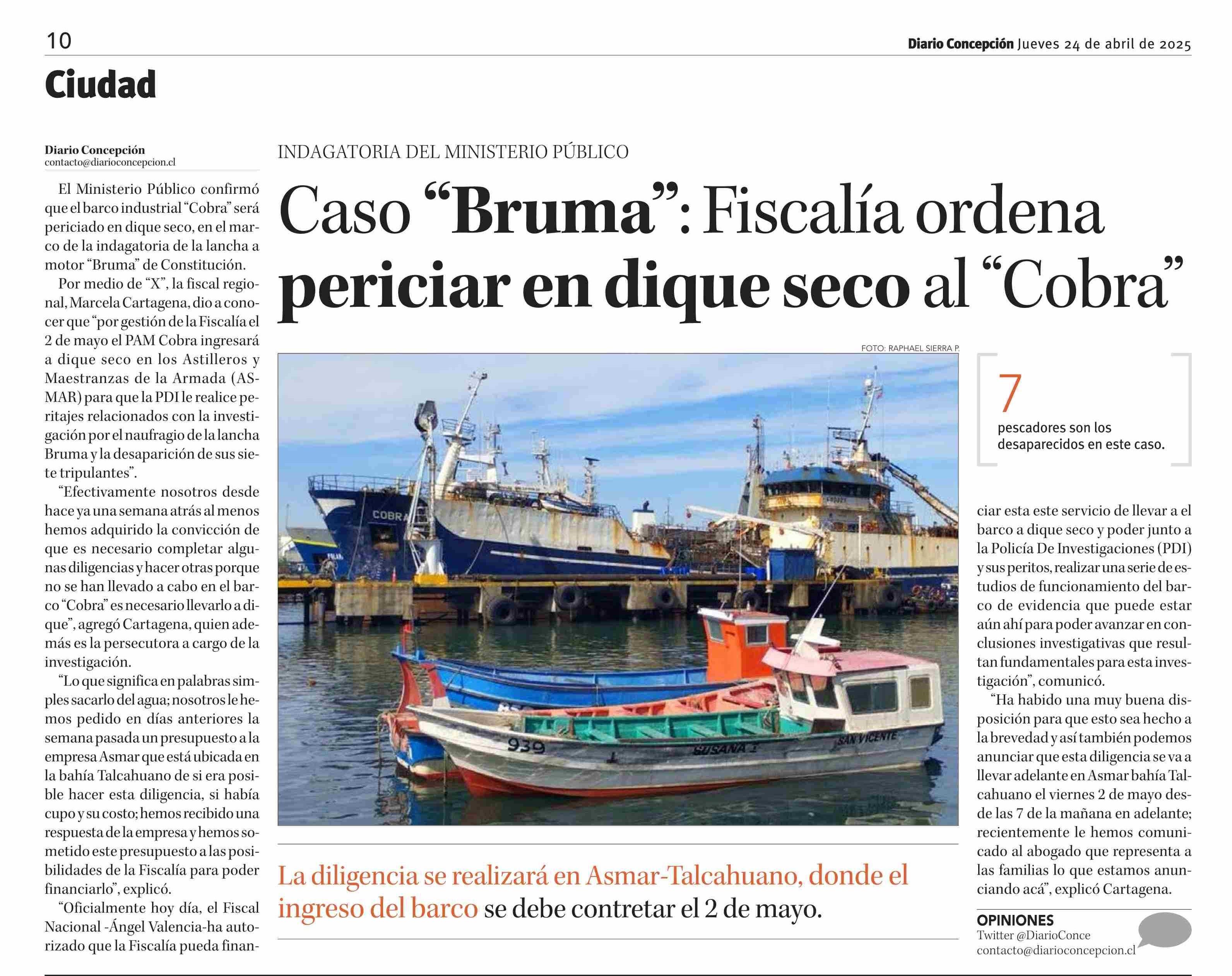 Caso "Bruma": Fiscalía ordena periciar en dique seco al "Cobra"