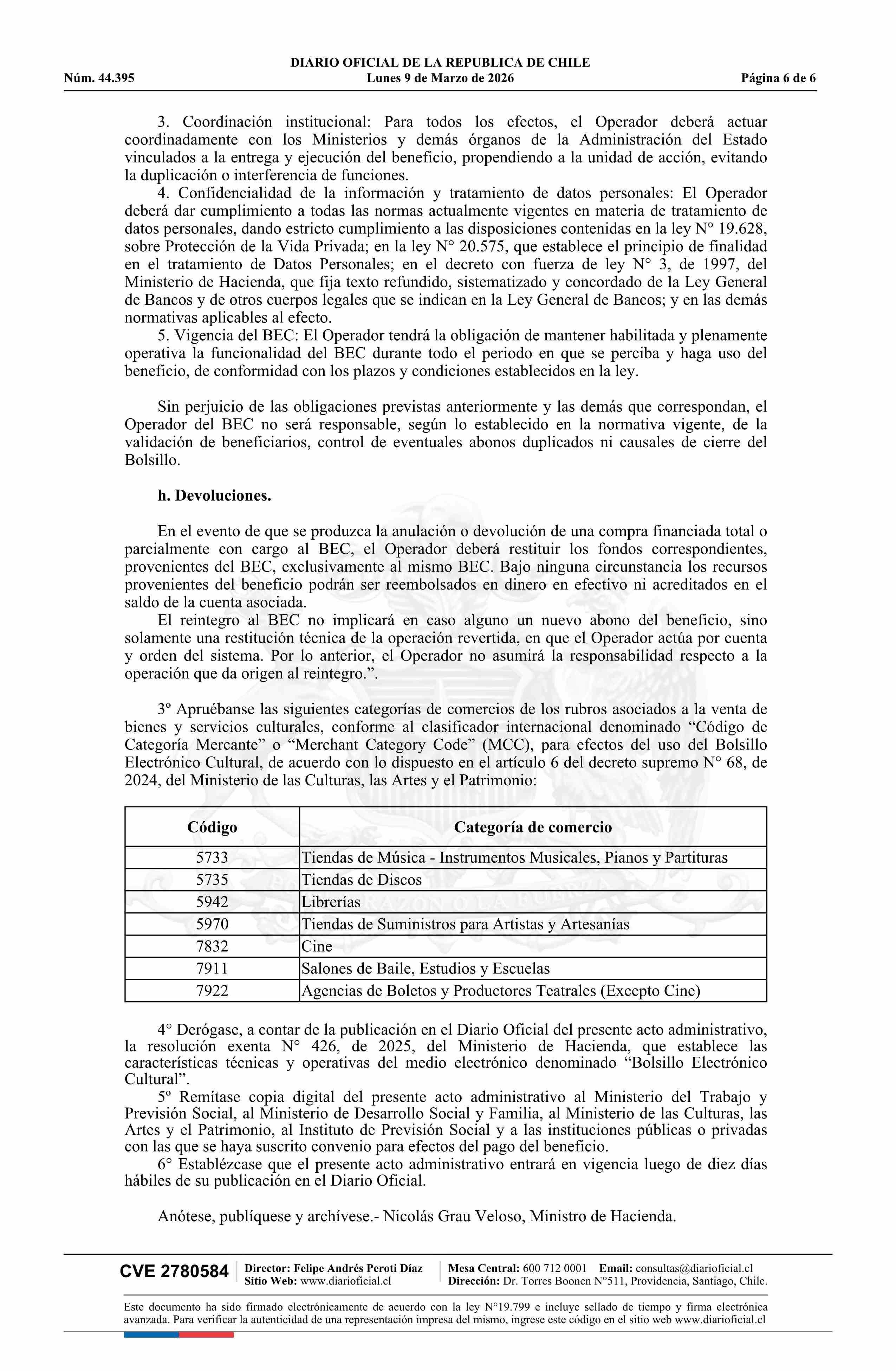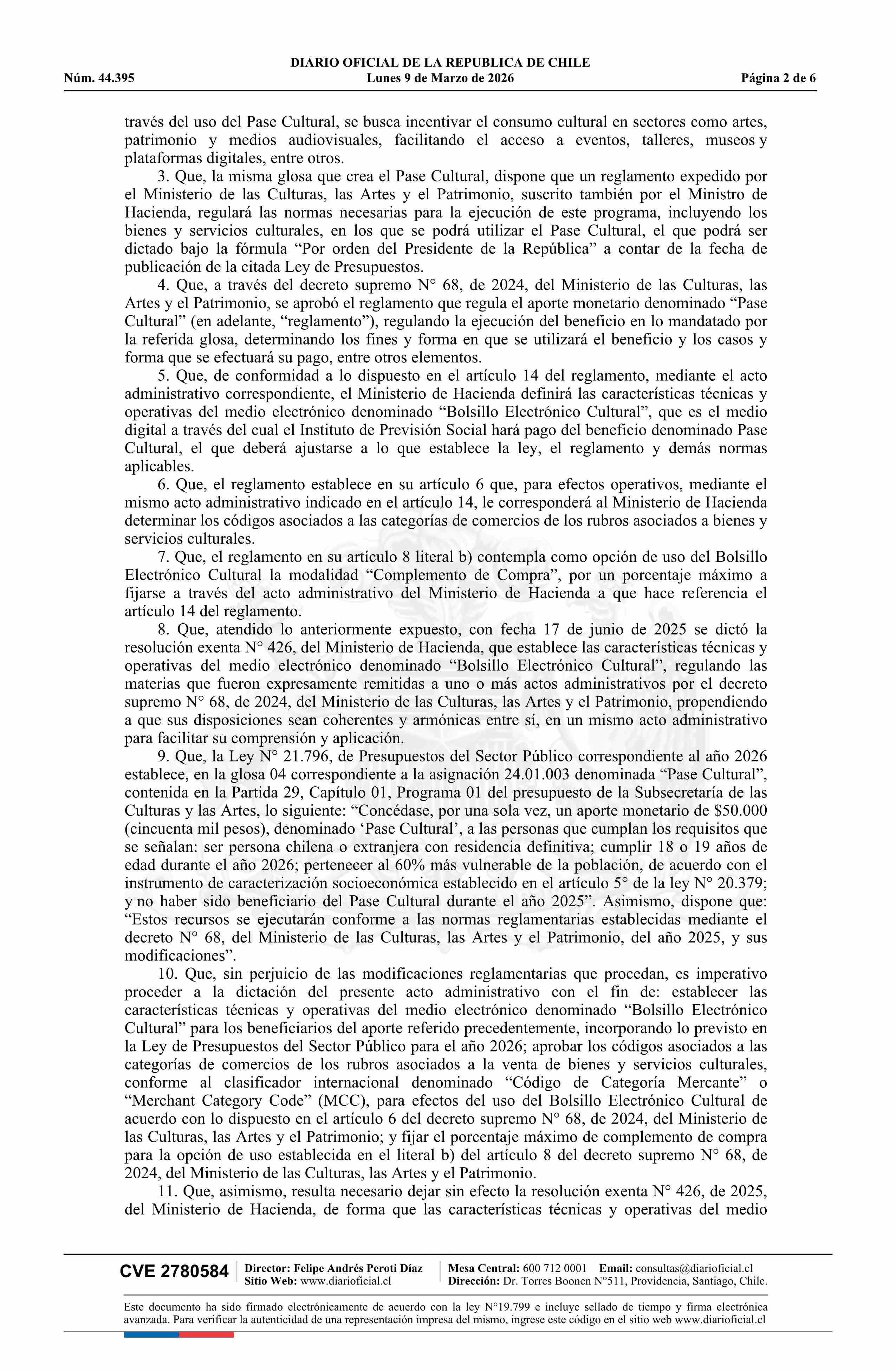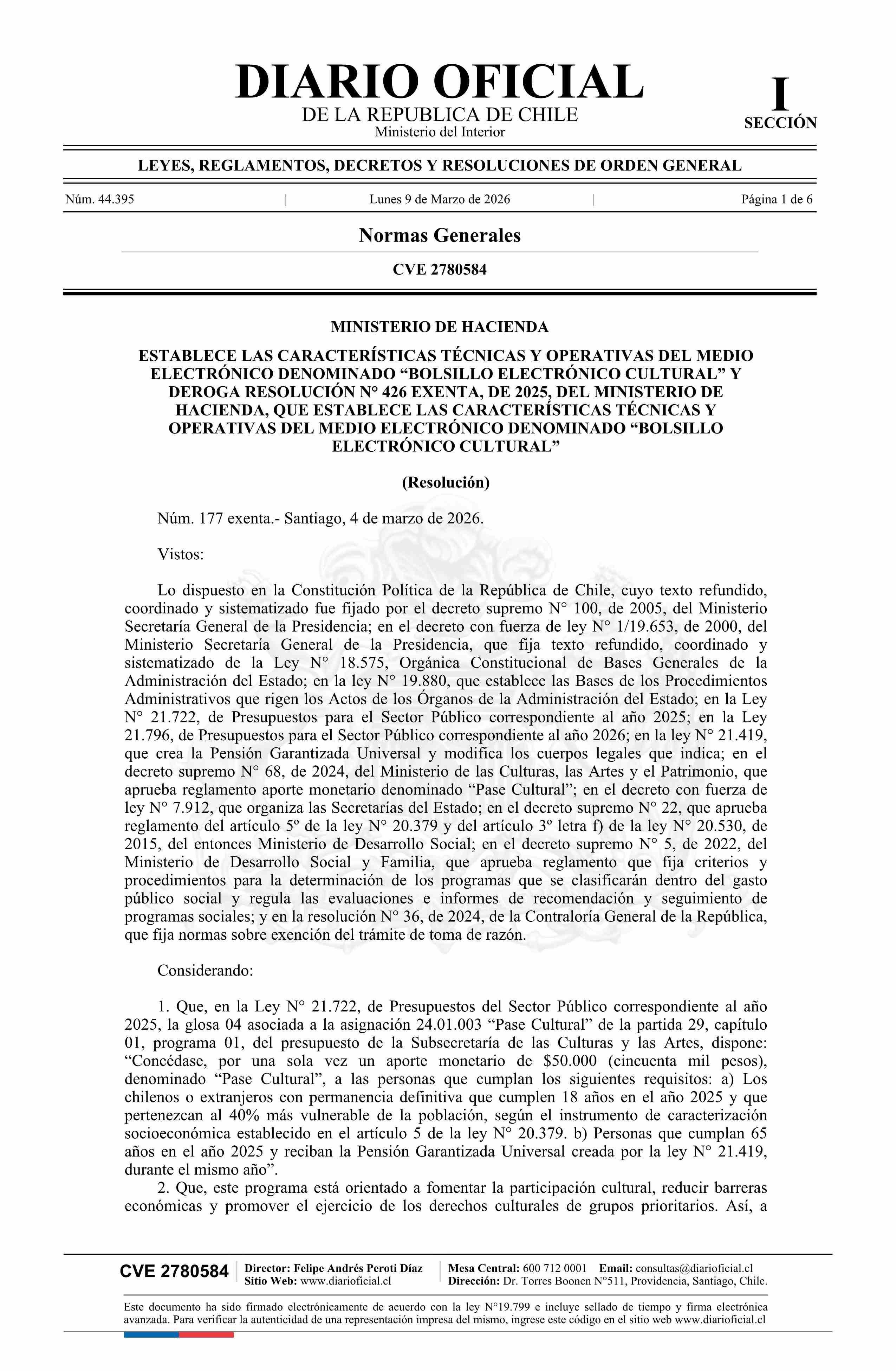 | Título: | Resolución exenta número 177, de 2026.- Establece las características técnicas y operativas del medio electrónico denominado Bolsillo Electrónico Cultural y deroga resolución N° 426 exenta, de 2025, que establece las características técnicas y operativas del medio electrónico denominado Bolsillo Ele |