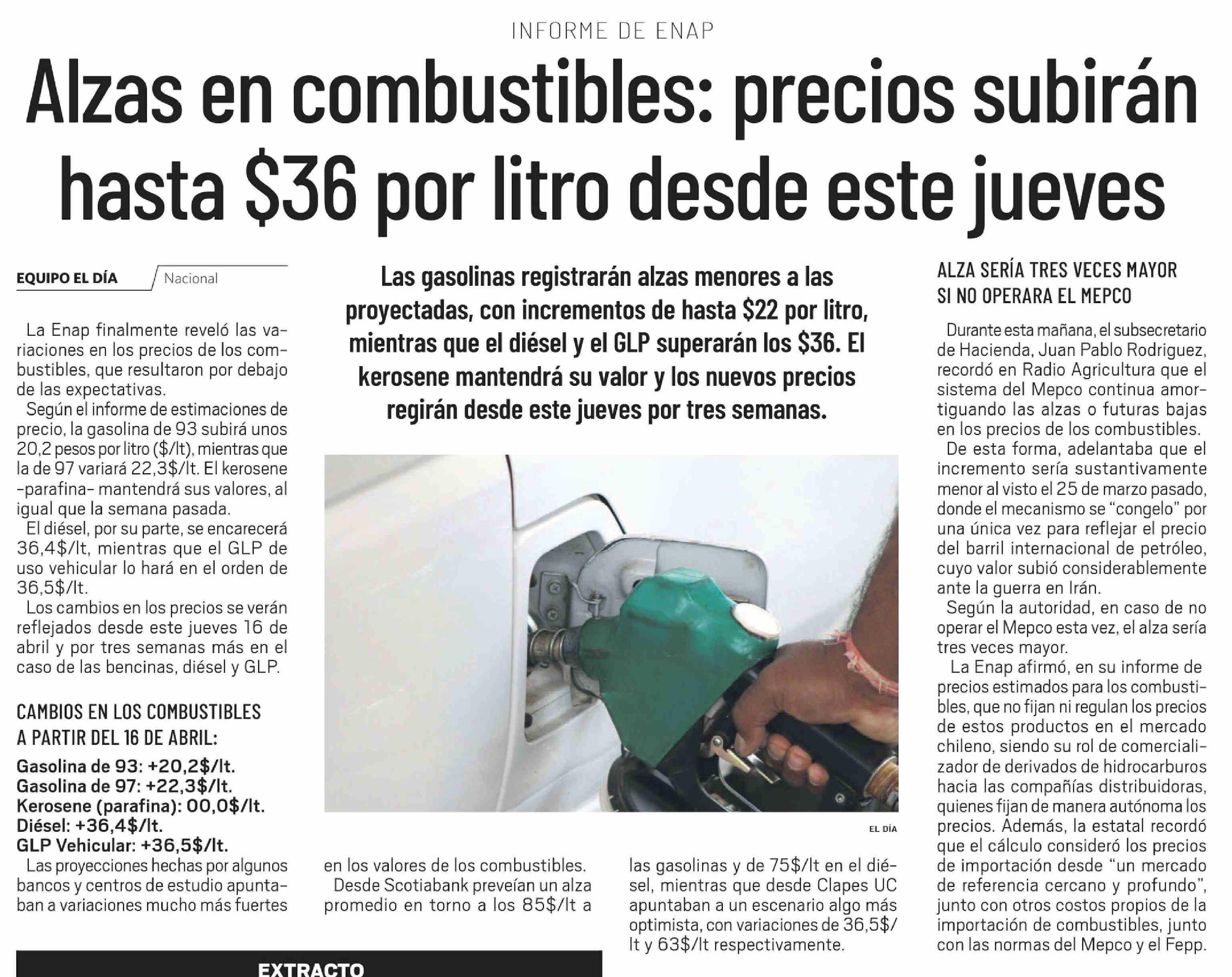 Alzas en combustibles: precios subirán hasta $36 por litro desde este jueves