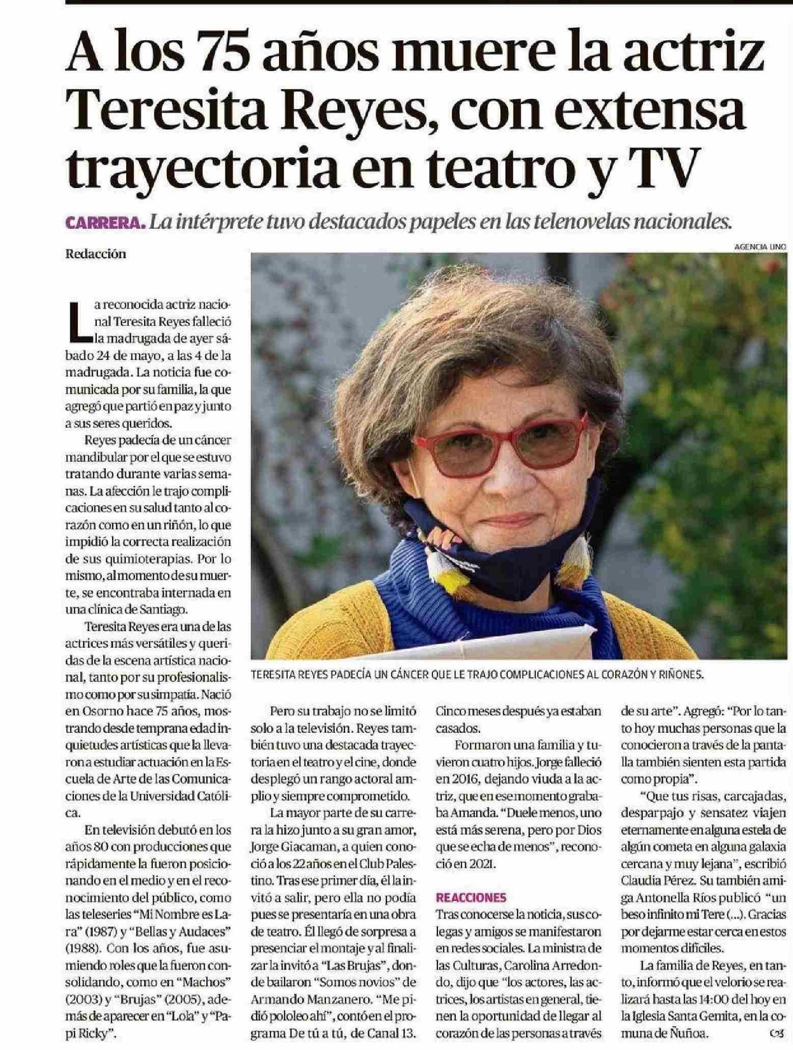 Alos 75 años muere la actriz Teresita Reyes, con extensa trayectoria en teatro y TV
