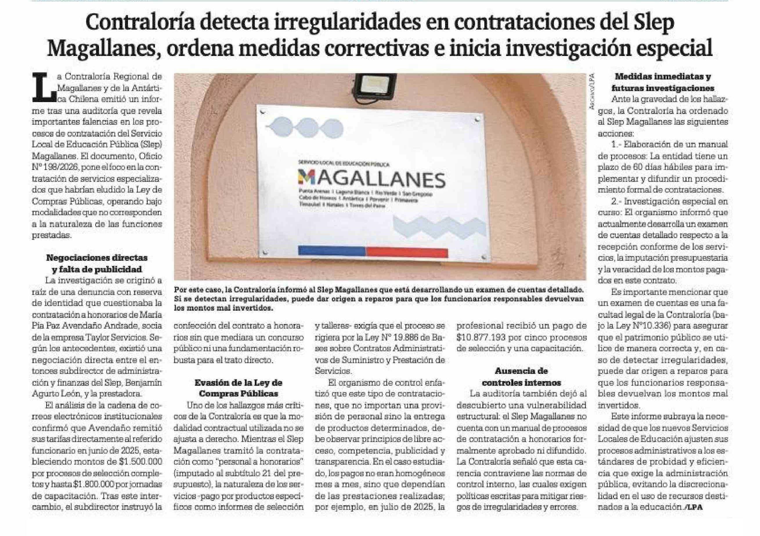 | Título: | Contraloría detecta irregularidades en contrataciones del Slep Magallanes, ordena medidas correctivas e inicia investigación especial |