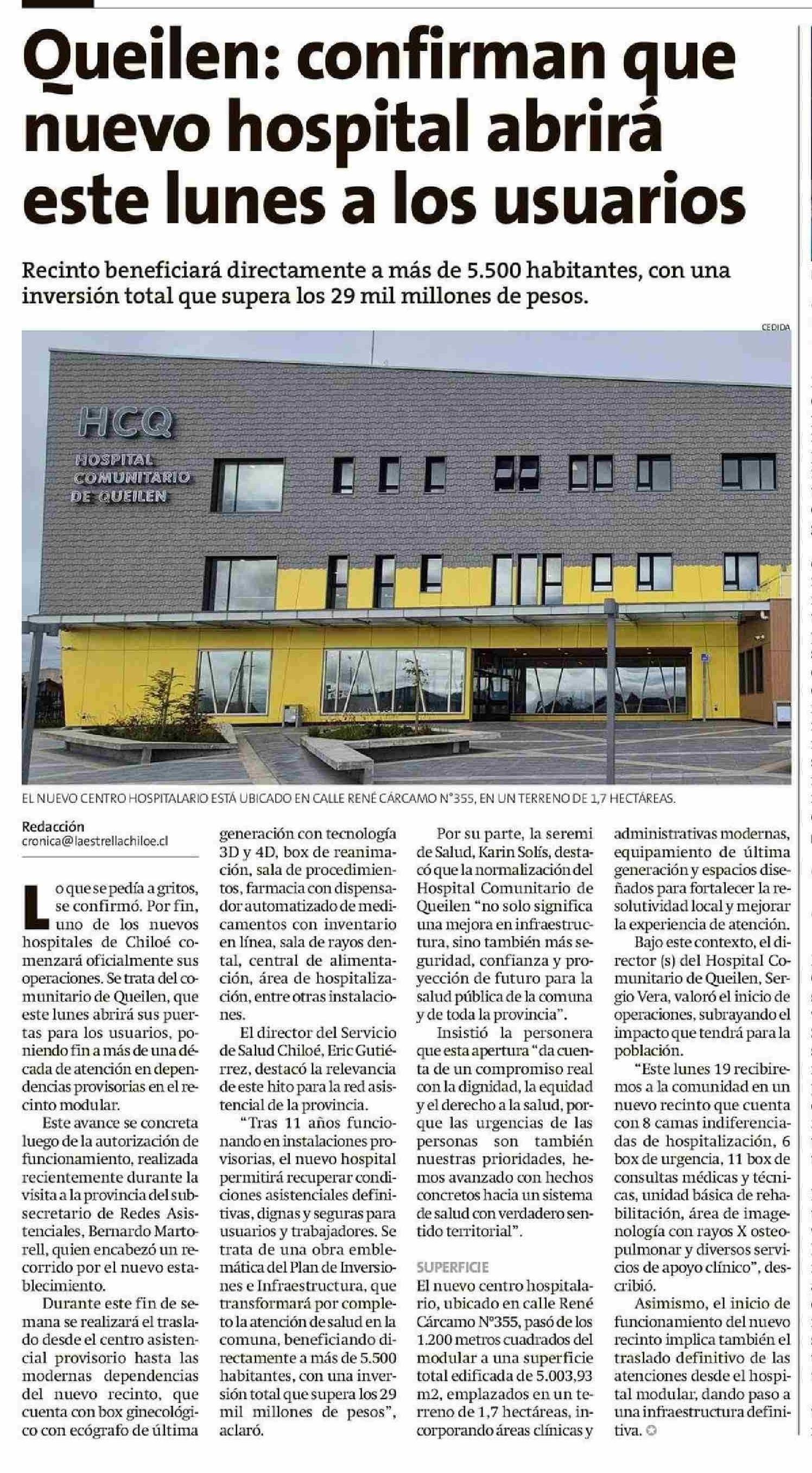 Queilen: confirman que nuevo hospital abrirá este lunes a los usuarios