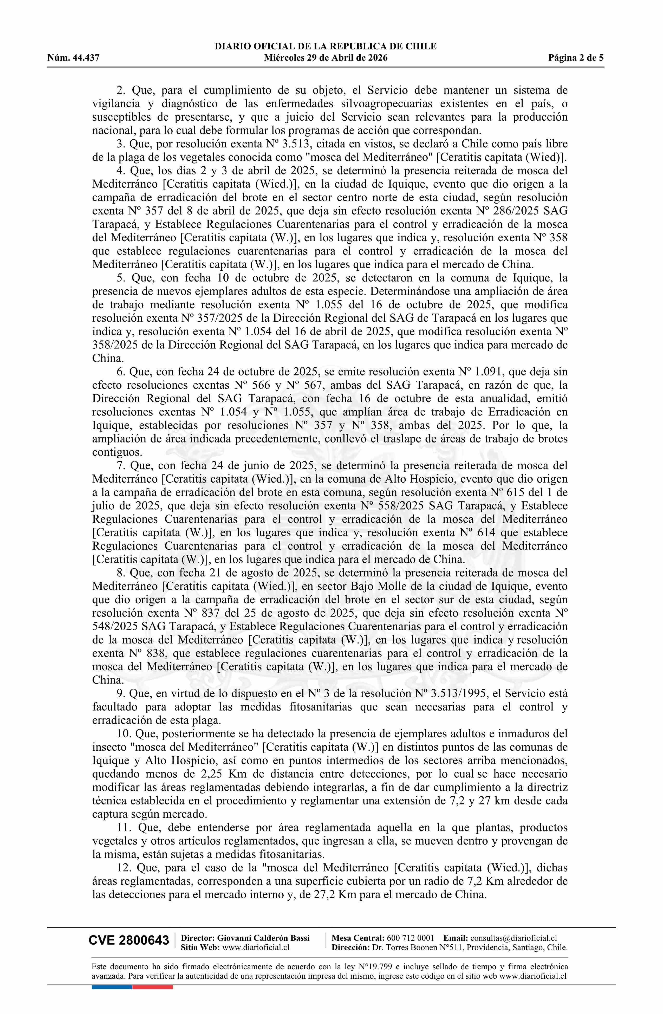 Título: Resolución exenta número 528, de 2026.- Amplía área de regulaciones cuarentenarias para el control y erradicación de la Mosca del Mediterráneo (Ceratitis capitata W.) en los lugares que indica, en la Región de Tarapacá