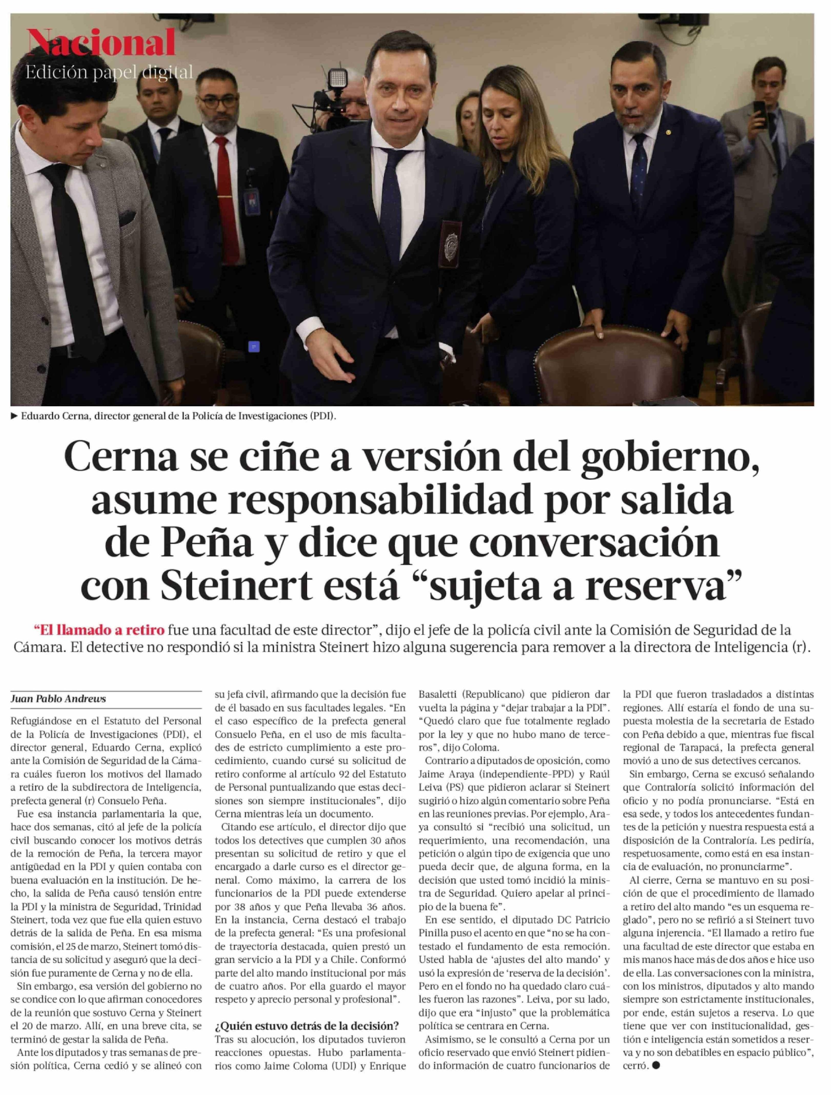 Cerna se ciñe a versión del gobierno, asume responsabilidad por salida de Peña y dice que conversación con Steinert está "sujeta a reserva"