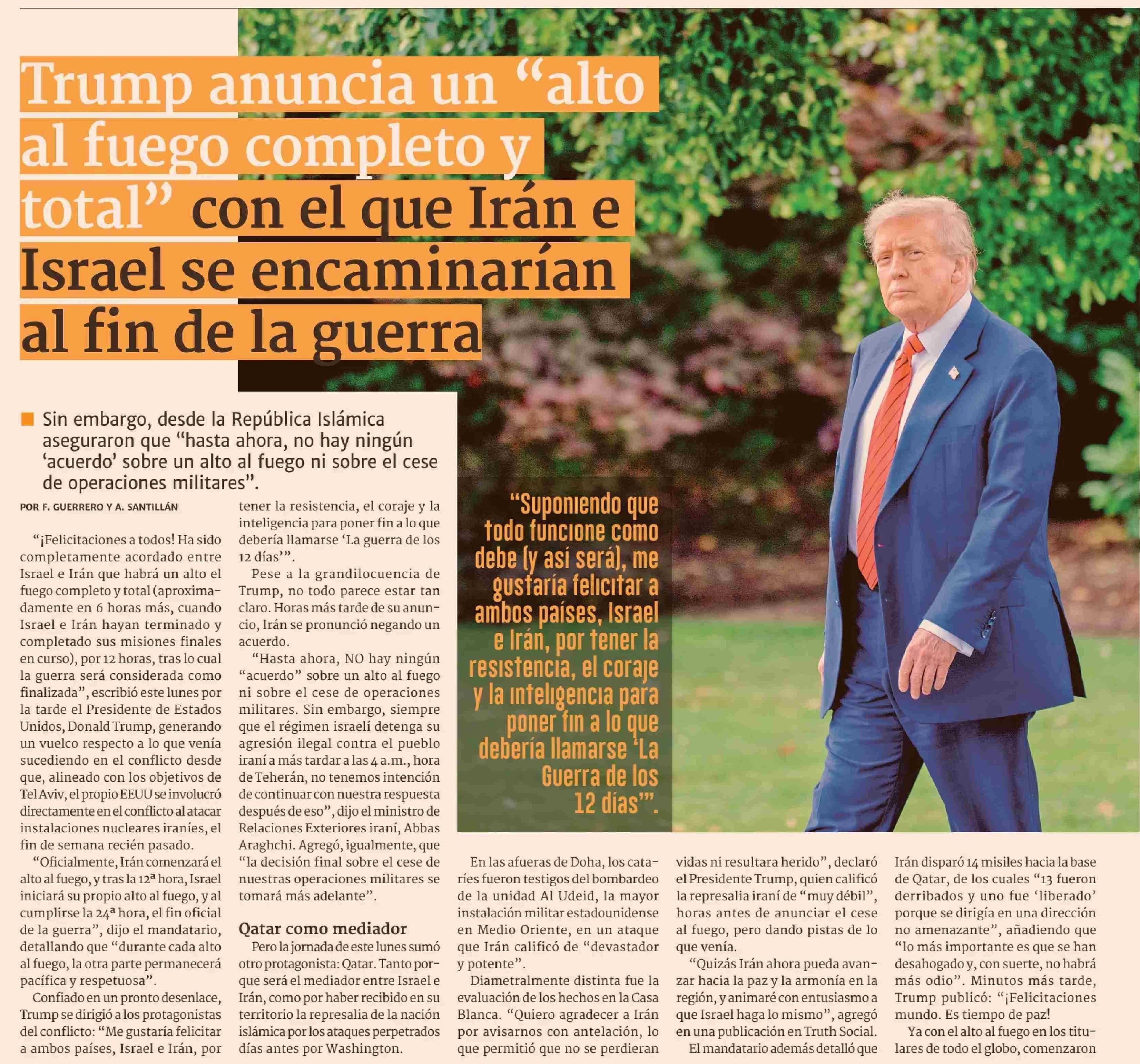 Trump anuncia un " alto al fuego completo y total" con el que Irán e Israel se encaminarían al fin de la guerra