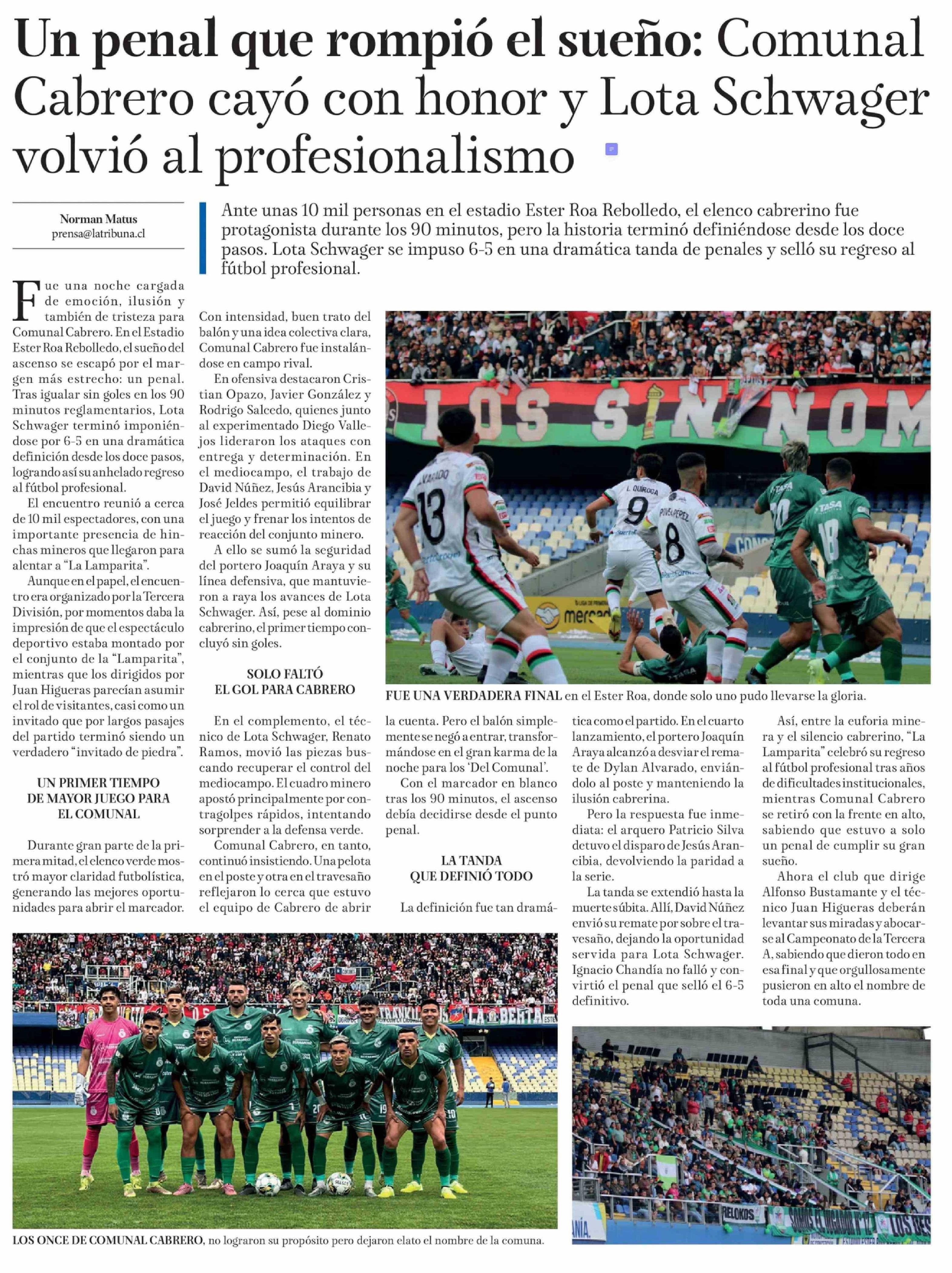 Un penal que rompió el sueño: Comunal Cabrero cayó con honor y Lota Schwager volvió al profesionalismo