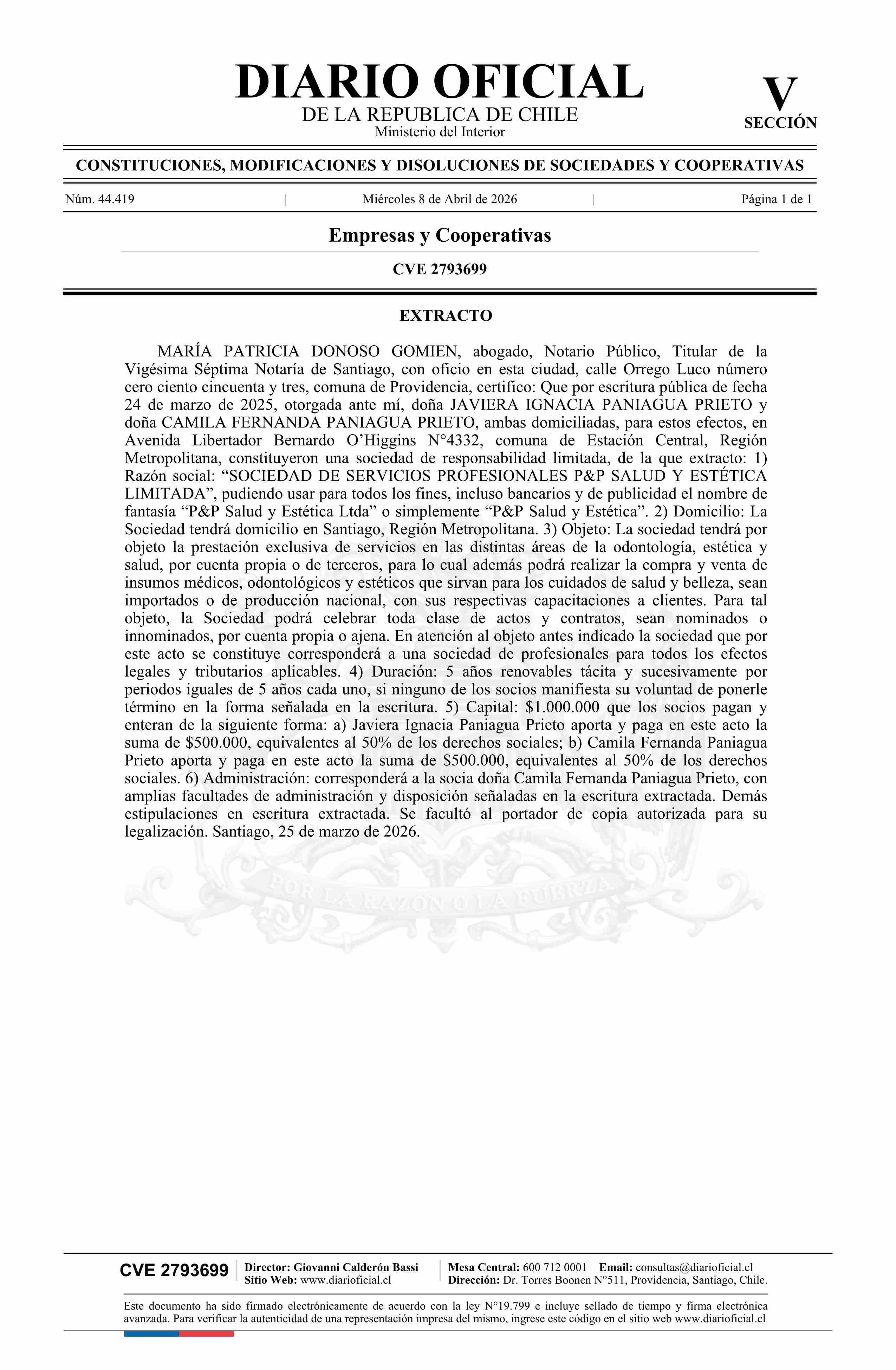 SOCIEDAD DE SERVICIOS PROFESIONALES P&P SALUD Y ESTÉTICA LIMITADA