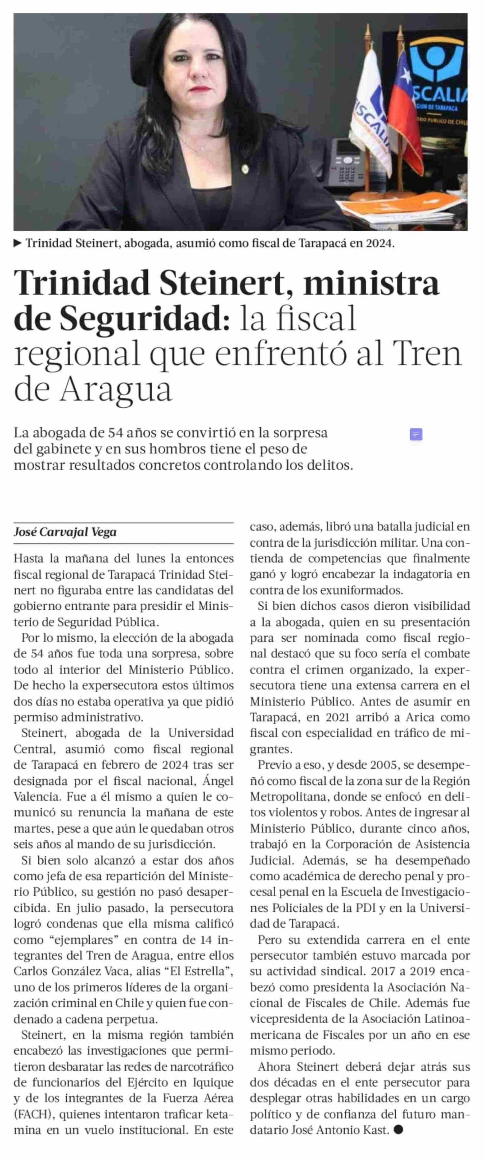 Título: Trinidad Steinert, ministra de Seguridad: la fiscal regional que enfrentó al Tren de Aragua